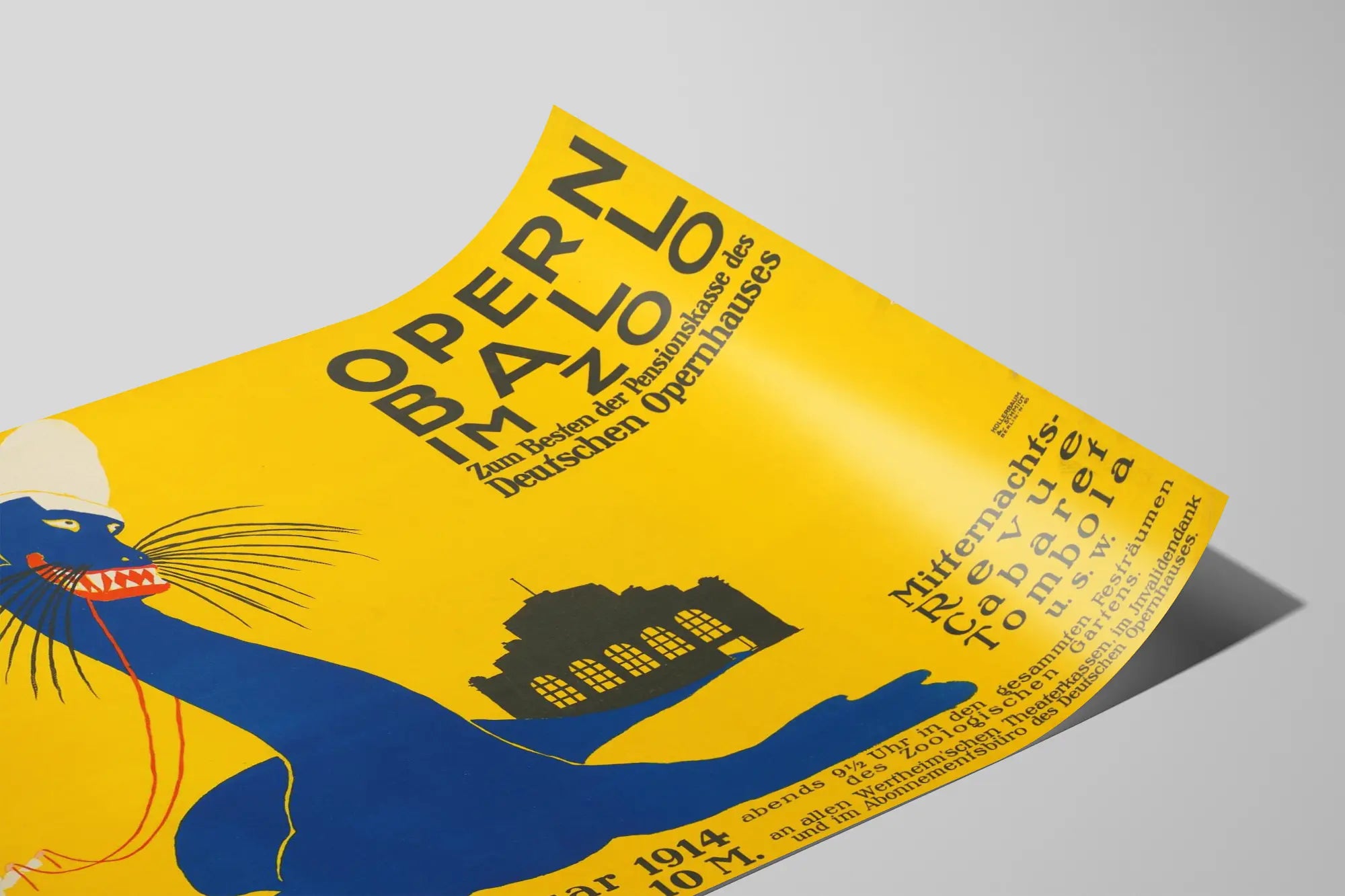 Denna affisch i konstnärlig och typografisk stil från tiden åkallar en kulturell händelse — en operaball på zoo — som ägde rum den 26 januari 1914 i Berlin, vilket framgår av texten på tyska. Den retroestetiska stilen, de enkla formerna och användningen av primärfärger gör detta plakat till ett perfekt stycke för konstälskare av grafisk konst från början av 1900-talet.