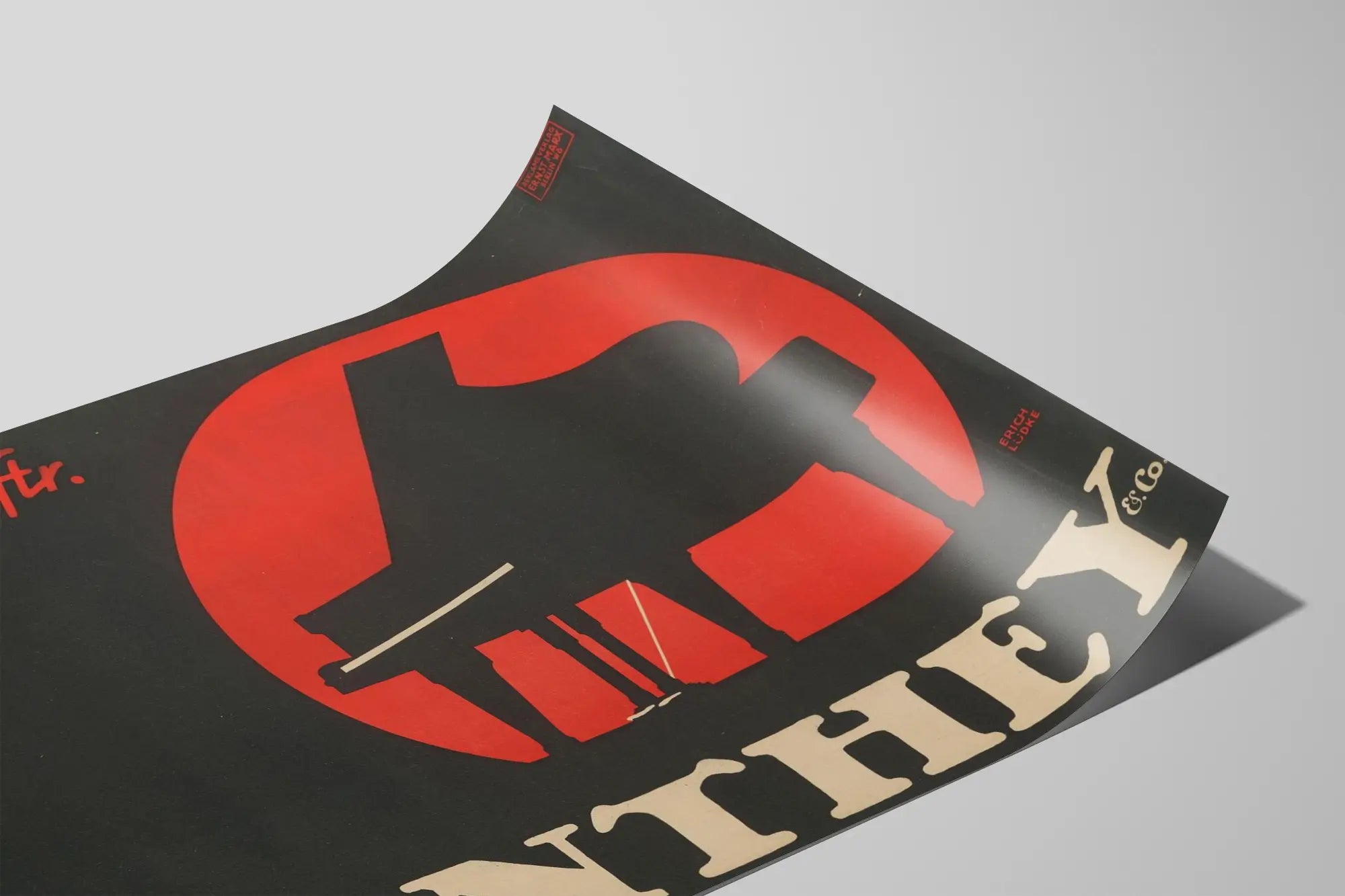 Upptäck denna ikoniska vintageaffisch som föreställer siluetten av ett stiliserat svart flygelpiano mot en röd cirkulär bakgrund. Denna gamla reklamposter visar texten « Potsdamerstr. 31 » upptill till vänster, vilket sannolikt hänvisar till en adress kopplad till handeln F. Manthey & Co, vars namn finns längst ner i vitt mot en svart bakgrund. Den grafiska sammansättningen utmärker sig genom sitt starka kontrast mellan den klara röda färgen och den djupa svarta, vilket framkallar en elegant retroestetik, perfekt för en originell väggdekoration. Enkelheten i formerna och den balanserade layouten ger en känsla av äkthet och tidsenlig charm till varje inredning. En väggaffisch som är idealisk för musik- och vintageinredningsälskare, och som passar perfekt i ett vardagsrum, ett kontor eller ett musikrum, och erbjuder en visuell mötesplats mellan konst och musikaliskt kulturarv. Med sina rena linjer och sin gammaldags typografiska stil utgör denna väggdekoration ett konstnärligt och suggestivt föremål, perfekt för att berika en vägg med ett stycke som andas historia och karaktär. En väggbild som fångar nostalgin från förr, och skapar en varm och sofistikerad atmosfär tack vare sitt färgspel och sitt ikoniska grafiska uttryck.