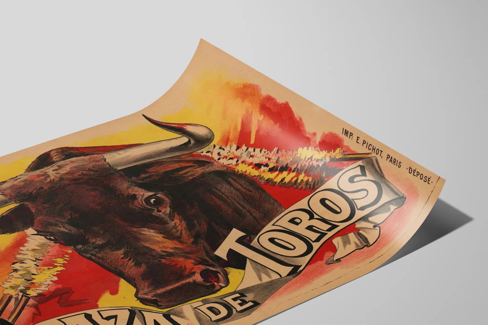 Denna vintageaffisch av Plaza de Toros är ett unikt konstverk som förhöjer din väggdekoration med en touch av äkthet och karaktär. Den framhäver en tjur i förgrunden, återgiven i detalj med varma och dynamiska färger, främst röda, gula och bruna nyanser som fångar hela intensiteten och passionen kopplad till tjurfäktningen. Denna affisch är perfekt för entusiaster av väggdekorationer med spanska influenser eller för dem som uppskattar djärva och uttrycksfulla element. Den grafiska stilen kombinerar skickligt linjeteckning och livfull färgskala, vilket skapar en vintageatmosfär typisk för gamla reklamaffischer. Den imponerande typografin av « Plaza de Toros » tillför en stark estetisk dimension och balanserar det centrala motivet. Denna poster passar utmärkt i vardagsrum, kontor eller kulturella utrymmen där man vill tillföra en originell dekorativ touch samtidigt som man väcker en känsla av tradition och festlighet. Den är också ett utmärkt val för att berika en samling av dekorativa affischer eller som en konstnärlig och uttrycksfull present. Denna noggrant tryckta väggbild framhäver den visuella kraften hos ett ikoniskt djur och värmen i de använda tonerna, vilket ger en dekorativ detalj som fångar ögat och stimulerar samtal. En perfekt väggdekoration för alla som vill väcka liv i sin inredning med en bild som är både historisk och emblematiskt, och som avslöjar en del av det spanska festtraditionen. Denna originella poster ger en äkta vintage-stil, idealisk för att personifiera din väggdekoration med en stark och passionerad accent.