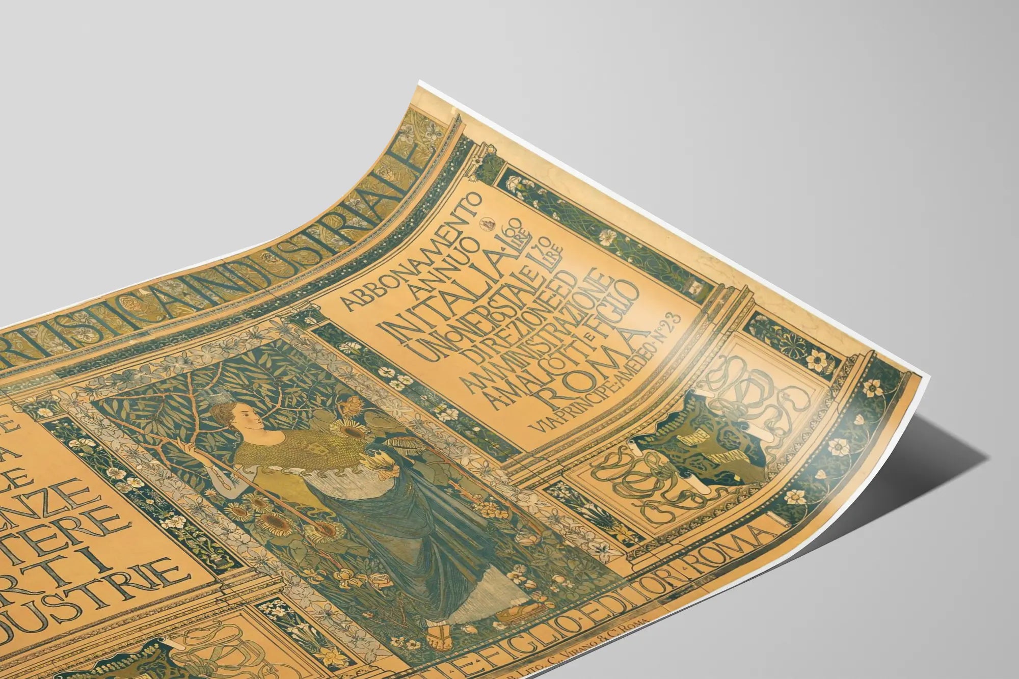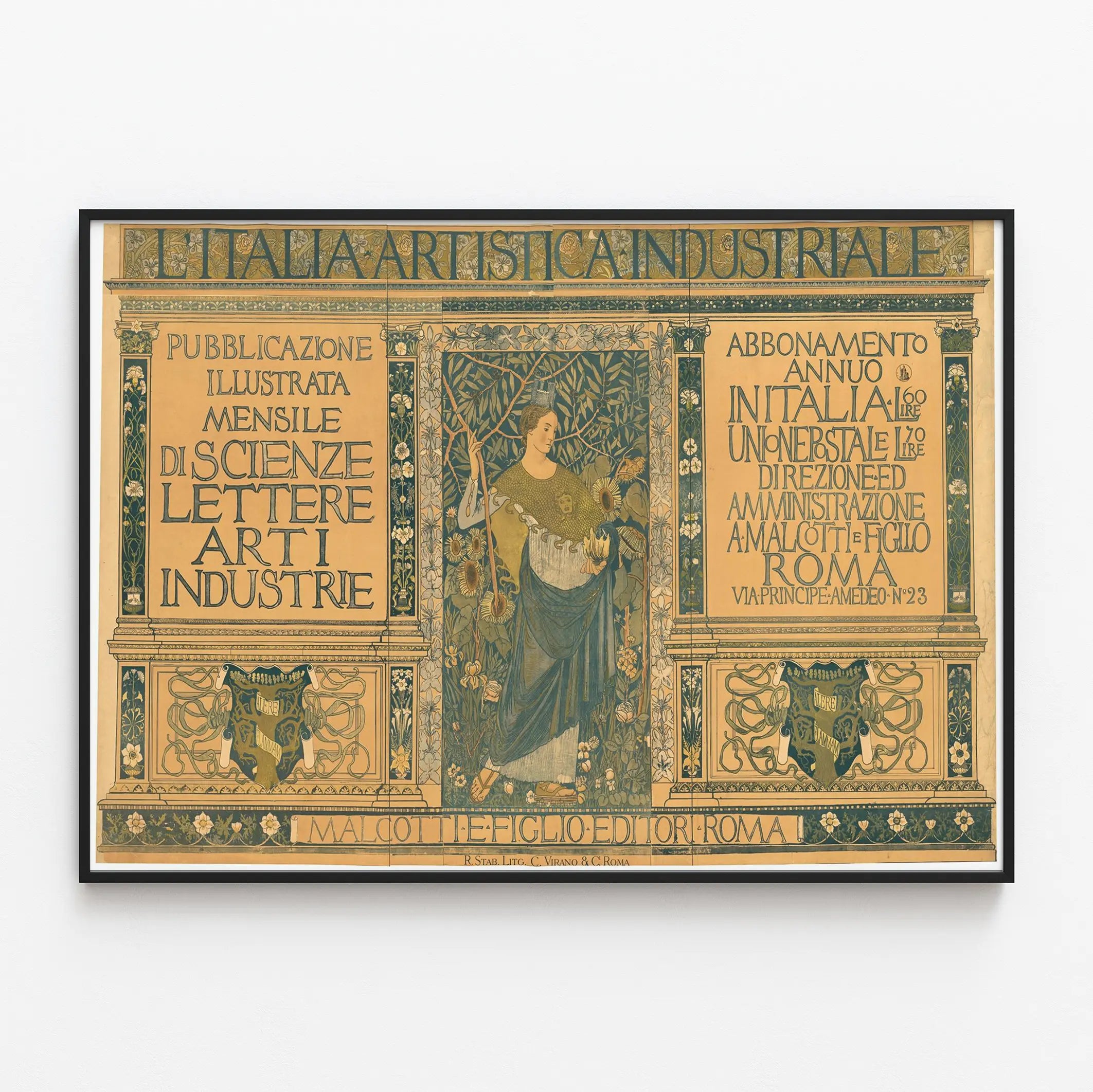 Upptäck denna vintageaffisch i art déco-format med titeln "Publicering L'Italia Artistica e Industriale", ett unikt grafiskt konstverk för din väggdekoration. Denna affisch framhäver den italienska ornamentala stilen med blomsterarrangemang och arkitektoniska motiv inspirerade av den vackra epoken. I mitten står en elegant kvinnlig figur omgiven av solrosor och ett stiliserat växtlandskap, vilket understryker en harmoni mellan natur och konst, typisk för jugendstilens skapelser.
