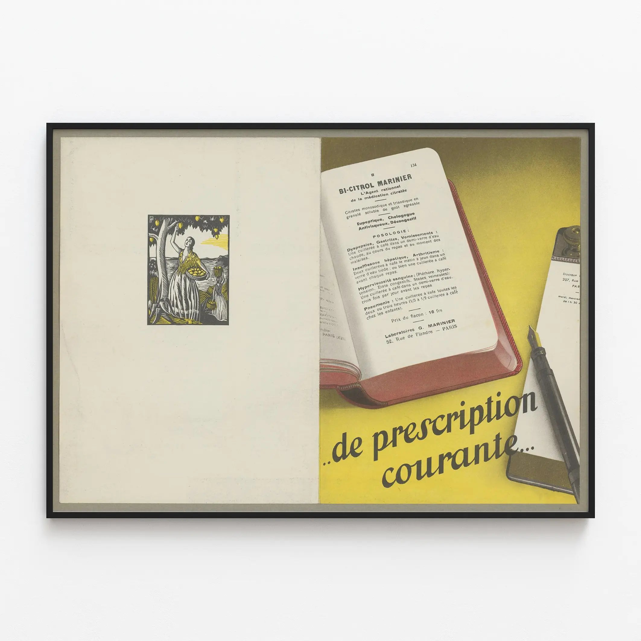 Upptäck denna vintageaffisch som lyfter fram läkemedlet Bi-Citrol Marinier, ett lösligt granulat baserat på monosodiska och trisodiska citrater, presenterat som en rationell komponent i citratmedicinering. Denna tidsenliga väggdekoration illustrerar en öppen manual med detaljerad dosering, tillsammans med en bläckpenna och ett medicinskt sigill, mot en ljusgul bakgrund som tillför energi och värme till helheten. Perfekt för entusiaster av retro väggdekoration eller samlare av medicinska reklamaffischer från mitten av 1900-talet, denna tavla har elegant typografi och ett autentiskt designuttryck. Som ett vanligt receptaffisch ger den en atmosfär som är både historisk och grafisk till ditt hem. Denna reklamtavla, med sina antydningar om antiepileptiska, gallutdrivande, antivirala och avsvällande effekter, kan fungera som ett blickfång i ett konsultationsrum, ett medicinsk kontor eller ett rum med vintageinspiration. Dess enkla och rena stil, som kombinerar tydlig text med grafiska element, gör den också till en dekorativ affisch som passar moderna miljöer som önskar en touch av äkthet och karaktär. Denna högkvalitativa poster lyfter fram ett historiskt läkemedelsprodukt samtidigt som den erbjuder en retro-chic estetik som uppskattas i väggdekorationer. Framför dina väggar med denna Bi-Citrol Marinier-affisch, en symbol för en tid då reklam blandades med väggkonst för att informera med elegans och enkelhet.