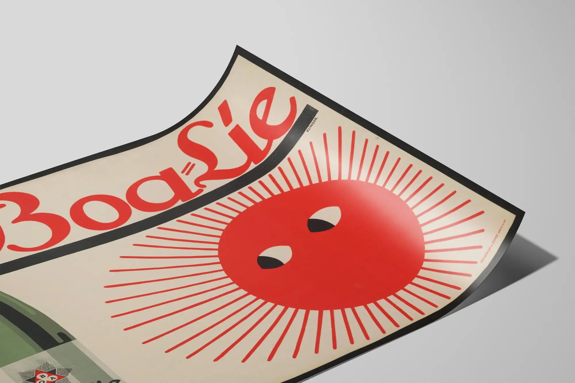 Upptäck denna vintageaffisch som illustrerar en reklam för Boa-Lie, en produkt presenterad som en stiliserad flaska. Denna väggdekoration visar en grön flaska till vänster med en detaljerad etikett och en inskrift Boa-Lie i svarta och röda kursiva bokstäver. Till höger, en stor, livfull röd sol i retrografisk stil fångar uppmärksamheten med två stiliserade ögon som ger ett lekfullt och originellt intryck. Den begränsade färgpaletten, huvudsakligen i rött, grönt, svart och vitt, skapar ett starkt kontrast, som ger dynamik och modernitet till detta konstnärliga stycke. Perfekt för en väggdekoration med vintage-tema eller en samling av gamla reklamaffischer, inbjuder denna poster till en resa in i det grafiska formgivningens historia. Oavsett om det gäller ett modernt eller klassiskt inre, tillför denna Boa-Lie-affisch en känsla av äkthet och retrocharm. Dess enkla men slående design gör den också till ett dekorativt inslag som fångar blick och väcker nyfikenhet. Denna väggdekoration är idealisk för konstälskare, vintageentusiaster eller samlare av gamla reklambilder, och passar lika bra i ett vardagsrum, kök eller kontor. Kombinationen av kursiv typografi, geometrisk stil och den visuella lekfullheten mellan flaskan och solen skapar en vacker harmoni i detta väggstycke. Välj denna poster för att berika ditt hem med ett originellt och karaktärsfullt grafiskt inslag.