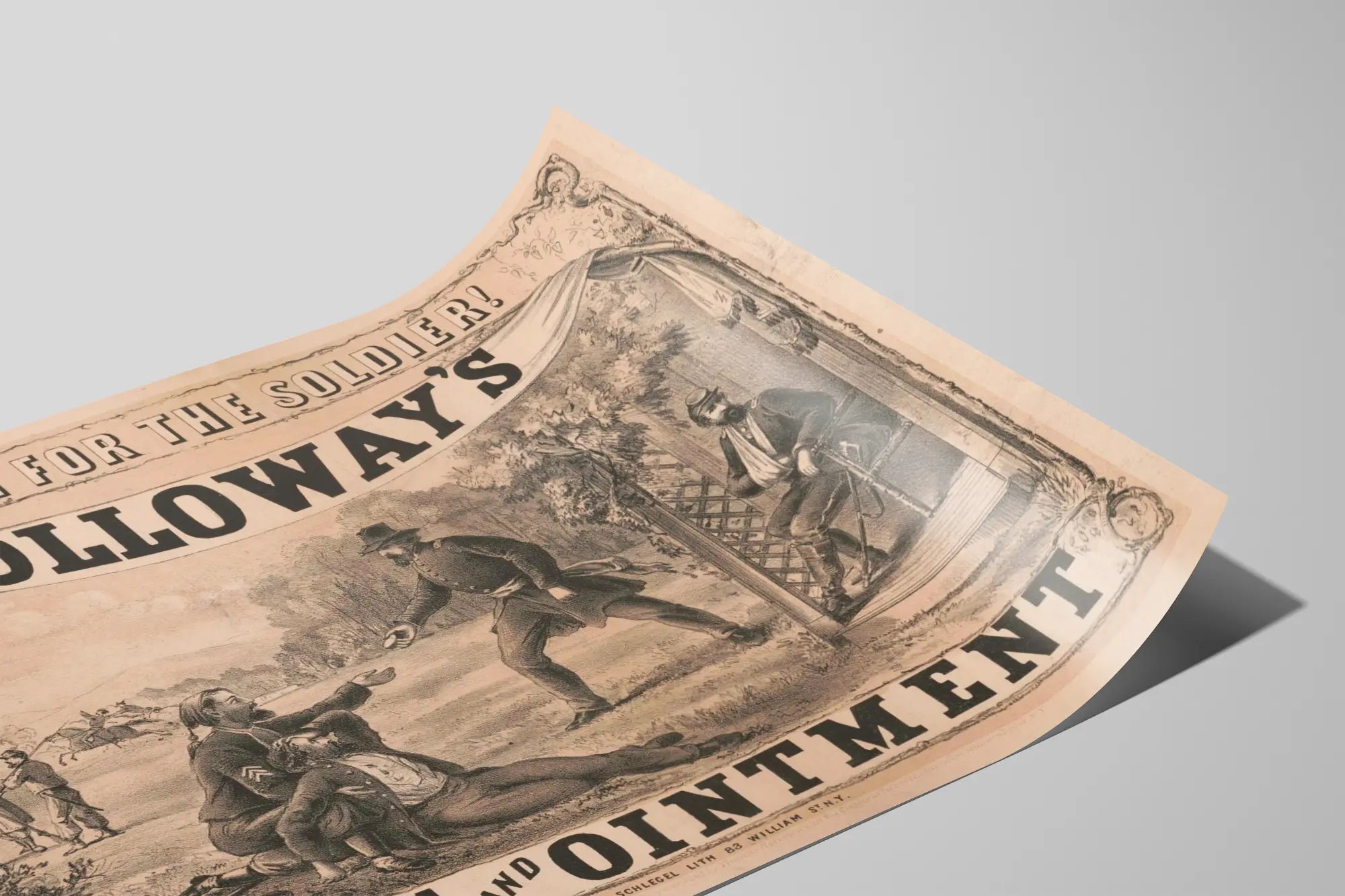 Upptäck denna vintageaffisch som illustrerar den tidsenliga reklamen för Holloway's Pills and Ointment, ett historiskt affisch för väggdekoration. Denna retro väggdekoration visar en militär scen med soldater, vilket understryker den påstådda användningen av Holloway-produkter för soldaternas hälsa. Denna grafiska tavla i gravyrstil är inramad av dekorativa element som förstärker dess gamla och äkta karaktär. Affischen är ett vackert exempel på 1800-talets reklamkonst, ett föremål för väggdekoration som tillför en historisk och vintage känsla till ditt hem. Perfekt för entusiastiska samlare av gamla posters, denna unika pjäs fångar uppmärksamhet med sina illustrativa detaljer och sitt starka budskap om soldaternas hälsa och välbefinnande. Denna dekorativa affisch kan passa perfekt i ett vardagsrum, ett kontor eller ett rum dedikerat till militärhistoria eller samling av gamla affischer. Dess format och noggrant balanserade sammansättning gör den till ett utmärkt val för att berika en äkta eller originell väggdekoration. Denna reklambild är en visuell hyllning till en tid då affischer användes för att marknadsföra folkliga botemedel med detaljerad och uttrycksfull konst.