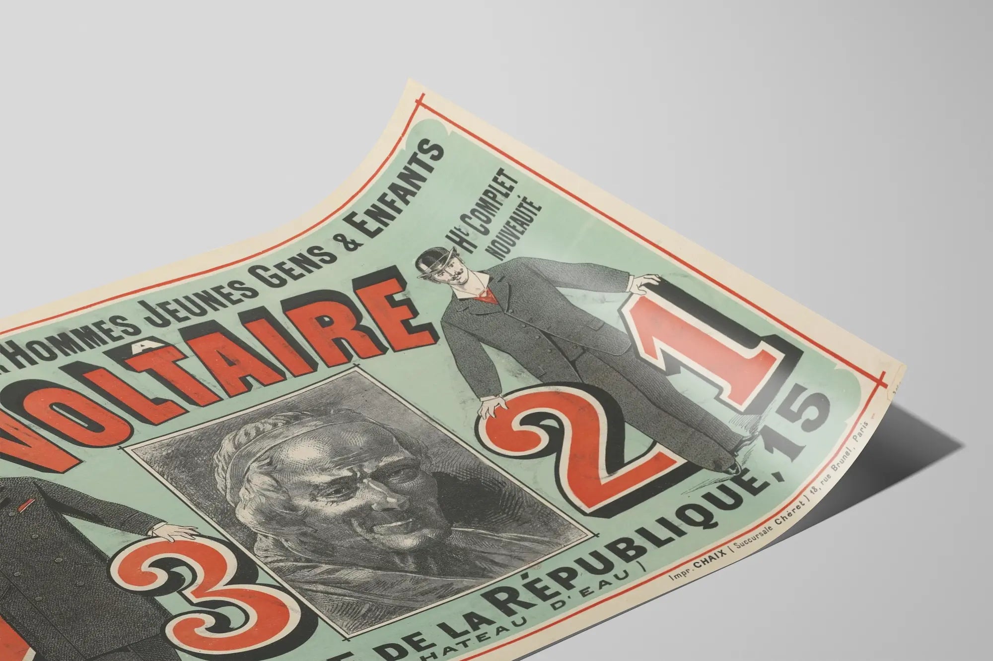 Denna vintage reklamaaffisch lyfter fram varumärket Voltaire, specialiserat på kläder för män, unga och barn. Postern visar en gammaldags stil med en grafisk komposition som är typisk för affischer från början av 1900-talet. Där ser man två stilfullt klädda män, iklädda rockar och klassiska kostymer, som håller stora röda och svarta siffror (23 och 21), sannolikt ett gatnummer eller en adress. I mitten finns ett svartvitt gravyrporträtt som kanske skildrar den historiska figur som inspirerat varumärket, samt en bred och färgglad typografi för namnet « VOLTAIRE », som omedelbart fångar uppmärksamheten. Denna väggdekoration erbjuder en retro charm och en mycket konstnärlig typografisk stil, perfekt för att framkalla den manliga modets värld från förr. Affischen kan vara ett vackert väggdekorationselement för ett vintageinrett hem, en klädbutik eller ett rum dedikerat till grafisk design och modets historia. Den utgör ett fantastiskt tidsenligt affisch som kombinerar illustration, typografi och gammal reklam för att skapa en äkta och elegant atmosfär.