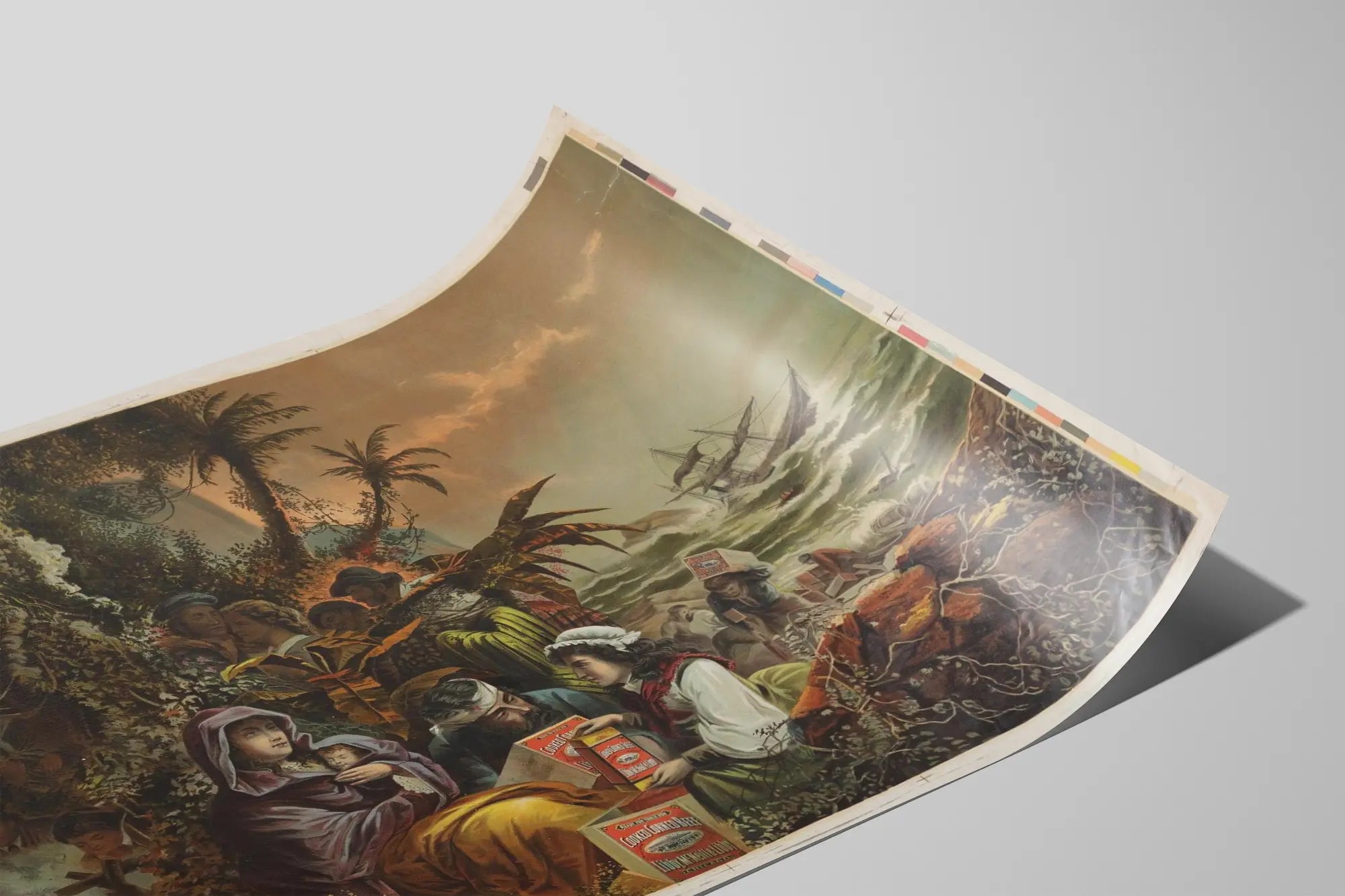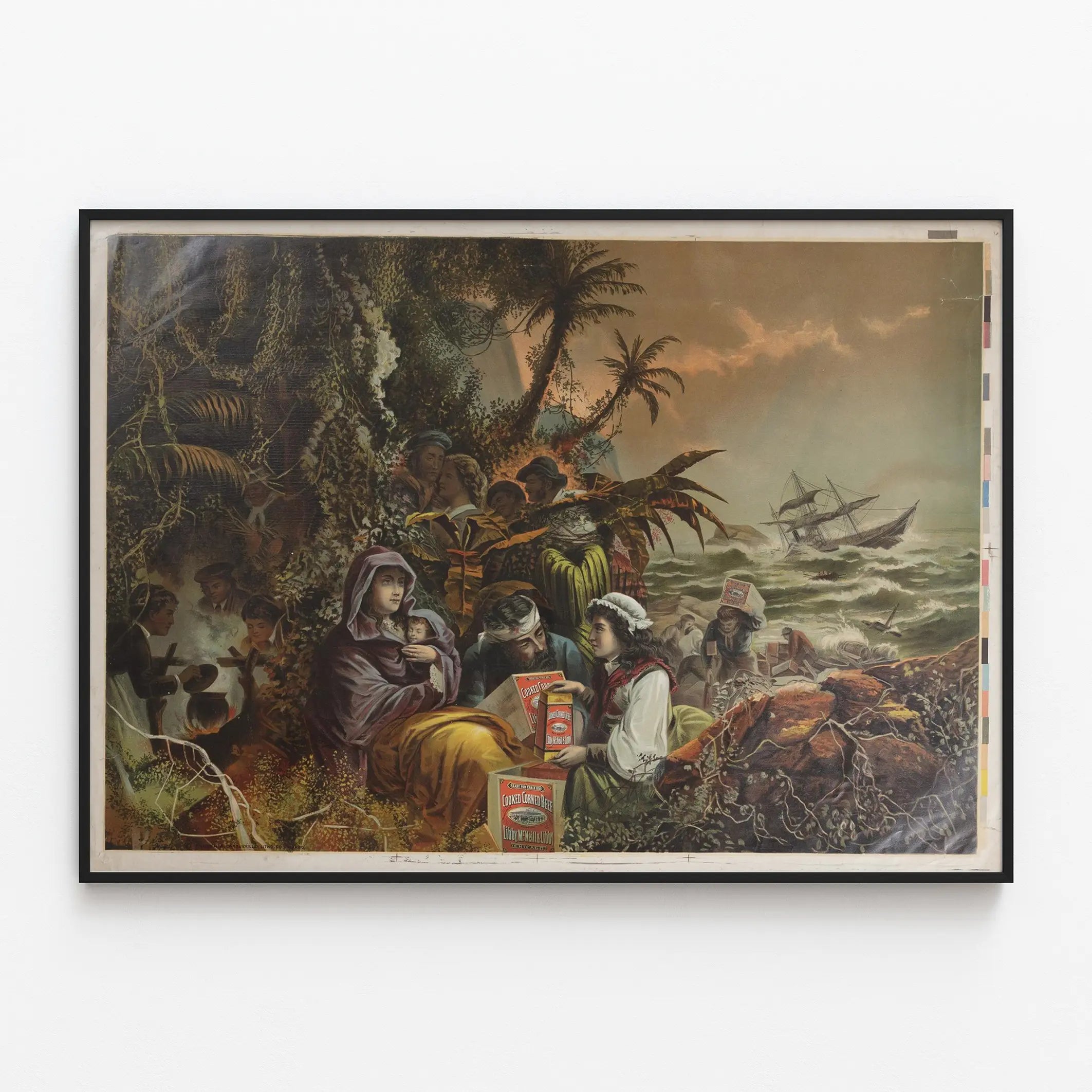Upptäck en enastående vintageaffisch som föreställer en rik detaljrik scen omgiven av märket Libby McNeill and Libby och dess produkt Cooked Corned Beef. Denna reklamposter framhäver konserverad corned beef i en miljö som blandar frodig natur, tidsenliga figurer och en stormig havsbild i bakgrunden, med ett skepp i nöd. Denna väggdekoration väcker en värld som är både historisk och maritim, vilket gör affischen till ett unikt föremål för entusiaster av vintagekonst och gamla annonser.