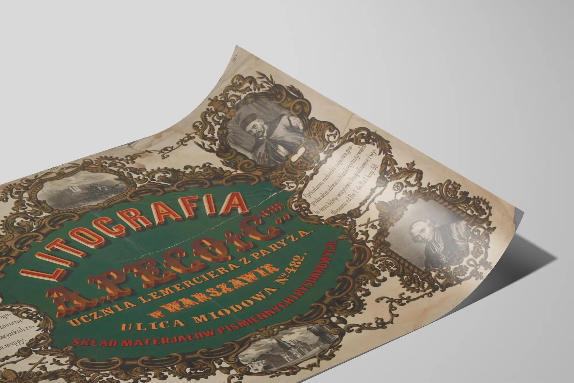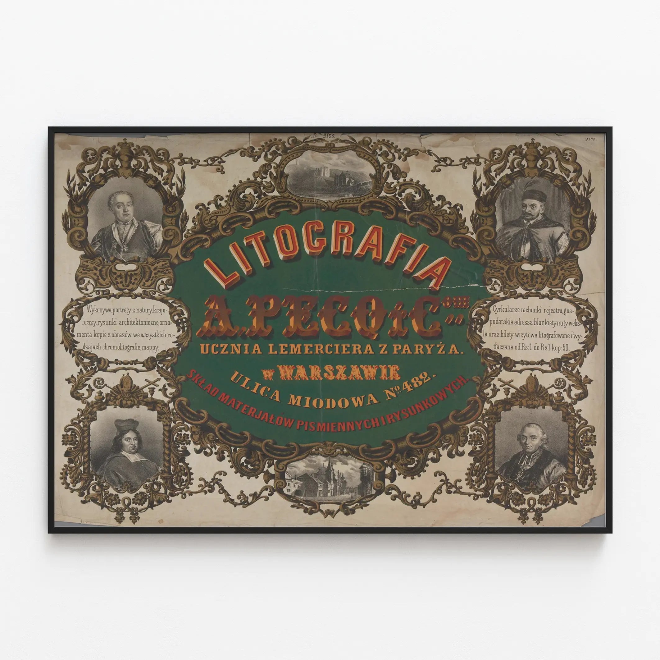 Denna vintageaffisch i litografisk reklamstil lyfter fram verkstaden "Litografia A. Pecq & Co." belägen i Warszawa, på Miodowa gatan nr 482. Denna gamla affisch utmärker sig genom sina rikligt utsmyckade dekorativa element, med ornamentala guldbelagda ramar runt porträtt och arkitektoniska illustrationer. Den färgglada centrala texten på grönt bakgrund drar blickarna till verkstadens namn, specialiserad på litografi, en historisk tryckteknik som uppskattas för reproduktion av detaljerade bilder och affischer.