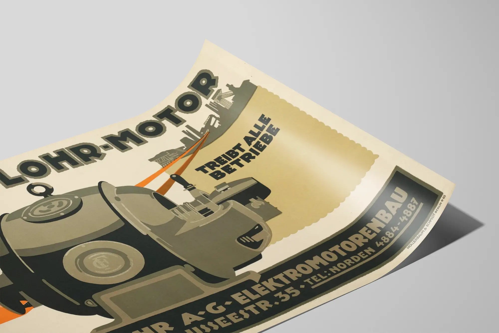 Denna väggaffisch är perfekt för en inredning med industriell eller vintage-tema, och tillför en äkta touch av ingenjörskonst och teknisk historia till ett modernistiskt eller retroinspirerat utrymme. Utmärkt som dekorativ poster för entusiaster av teknisk design, industrihistoria eller sällsynta föremål, inspirerar denna bild både till funktion och mekanisk estetik. Den tydligt synliga tyska texten förstärker den retro och autentiska stilen på denna väggdekoration, samtidigt som den visar företagets adress och kontaktuppgifter, vilket förstärker dess historiska karaktär.