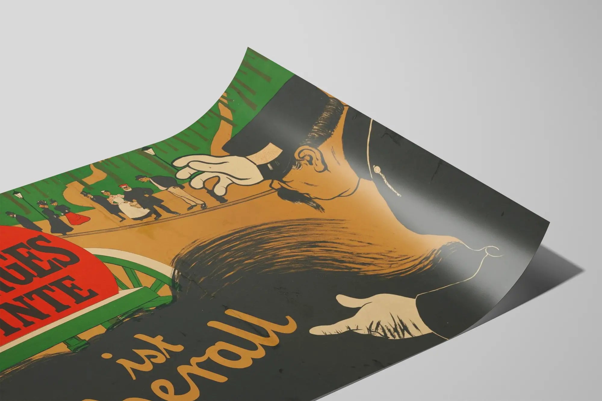 Den här vintageannonsen för RUNGE TINTE är ett anmärkningsvärt konstverk för alla väggdekorationer med retro- eller historiskt tema. Designen visar en ljusröd vagn med namnet RUNGE TINTE på en grön bakgrund, som tar en central plats och fångar ögat tack vare sin slående kontrast. Man kan också se en grupp figurer i gammalmodiga kläder som är typiska för en svunnen tid, vilket tillför en äkta charm och en nostalgisk atmosfär till affischen. Kompositionen illustrerar en polis eller väktare som noggrant tittar mot vagnen, vilket förstärker intrycket att produkten RUNGE TINTE finns överallt, som det står "ist überall" vilket betyder "finns överallt" på tyska. Denna affisch är ett perfekt val för den som vill tillföra en konstnärlig och retro touch till sitt hem, i en stil som påminner om gamla europeiska annonser. Den kan användas som dekorativ poster i utrymmen för vintageväggdekoration, kaféer, salonger eller kontor som vill framhäva en unik och iögonfallande inredning. Den enkla men effektiva grafiken, med sina starka färger och illustrativa stil, ger denna affisch en originell karaktär som passar perfekt i en väggdekoration som är både klassisk och populär. RUNGE TINTE-annonseringen kommer utan tvekan att bli ett centralt dekorationsinslag i ett rum, och tillföra äkthet och en liten visuell historia samtidigt som den lyfter fram konsten av grafisk reklam från början av 1900-talet.