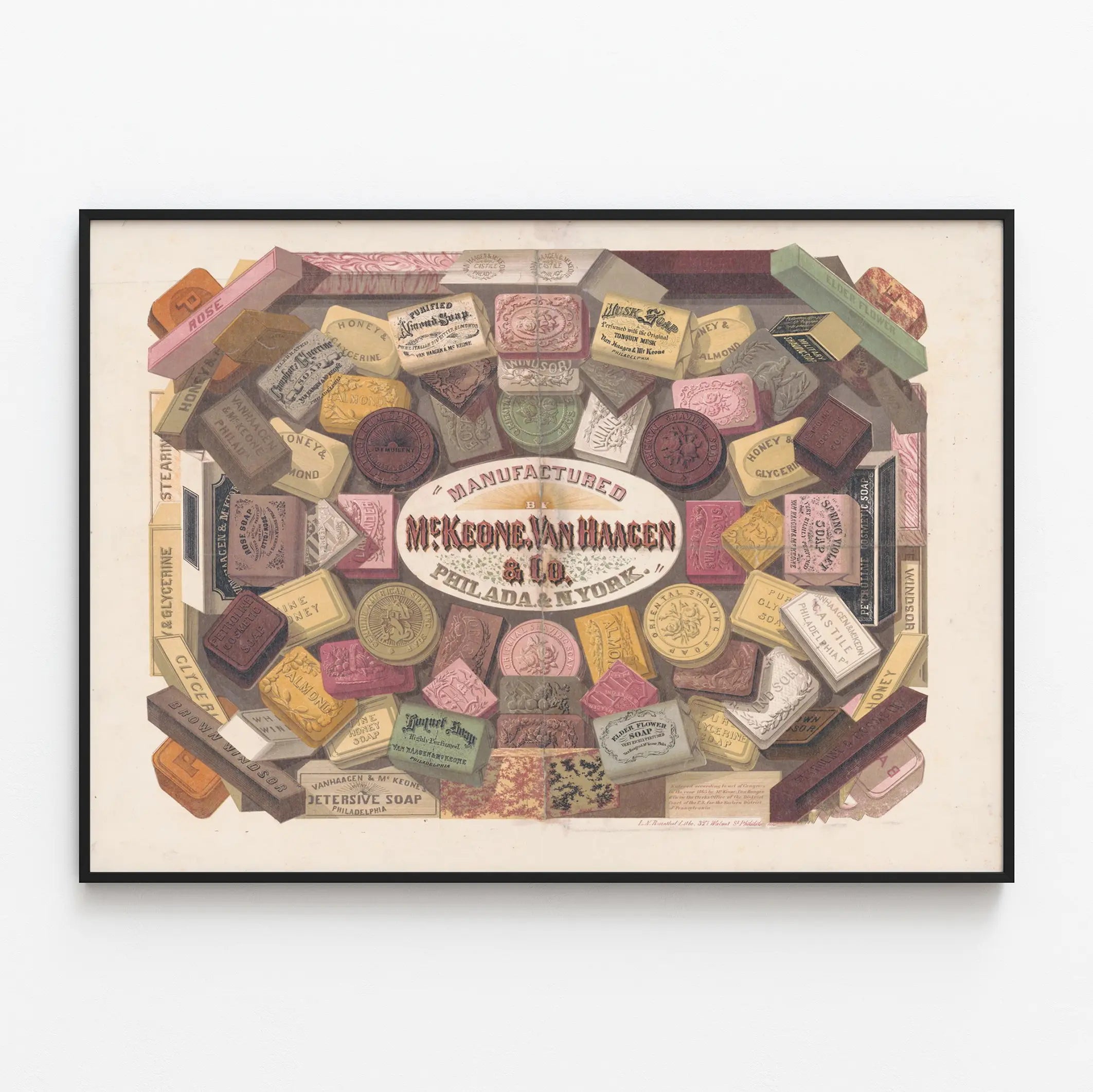 Denna vintageaffisch visar en elegant och färgstark sammansättning av tvålar tillverkade av McKeone Van Haagen & Co, ett företag baserat i Philadelphia och New York. Här upptäcker man en mängd olika tvålar i varierande former, stavar, rektanglar och runda, var och en fint illustrerad med olika inskriptioner och mönster. Tvålarna bär namn som "Rose Soap", "Honey & Almond", "Musk Soap", "Oriental Shaving Soap" eller "Elder Flower Soap", vilket återspeglar ett brett utbud av dofter och förfinade kosmetiska egenskaper. Denna fanliknande sammansättning lyfter fram produktens mångfald i en stil som är typisk för gamla reklamaffischer, förenande grafisk elegans och visuell rikedom. Den gamla typsnittsstilen som används runt tvålarna, särskilt på den centrala texten "Manufactured by McKeone Van Haagen & Co. Philada. & N. York.", förstärker den retro och äkta känslan av denna väggdekoration. Denna poster är perfekt för vintageinredningsentusiaster som vill tillföra en touch av historia och elegans till sitt hem. Med sin retrostil passar denna affisch utmärkt att framhäva i ett badrum eller ett utrymme för välbefinnande och skönhet. Dess detaljerade och färgrika format ger en originell och karaktärsfull fokuspunkt på väggen, mellan modernitet och nostalgi. De olika tvålblocket och deras etiketter utgör en vacker sammansmältning av reklam och dekorativ konst, vilket ger denna poster en tidlös charm som uppskattas av äkta väggdekorationälskare. Denna retrobild är en inbjudan att återupptäcka världen av traditionella tvålar i en omsorgsfull grafisk stil, perfekt för att berika en samling vintageaffischer eller skapa en tematisk dekorativ samling i ett modernt eller klassiskt hem.