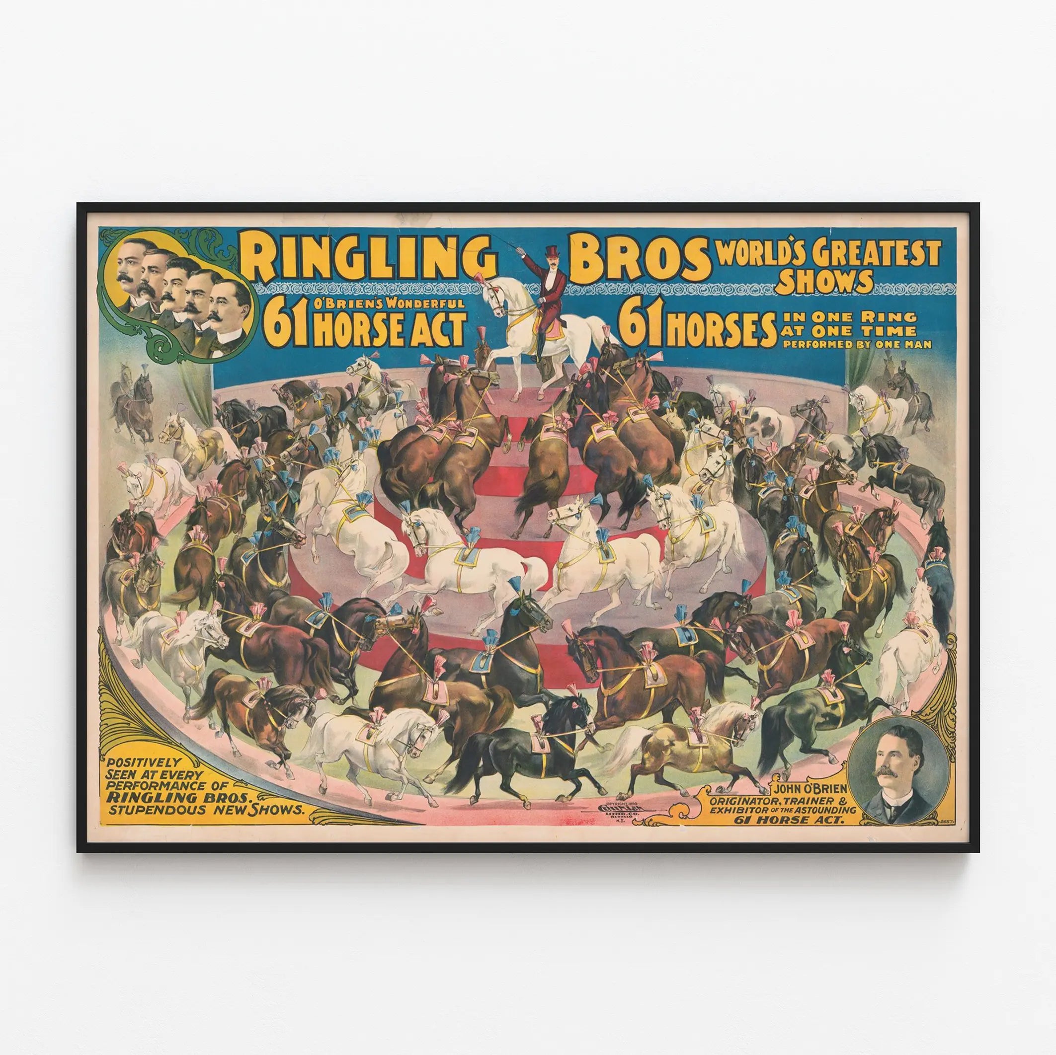 Upptäck denna fantastiska vintageaffisch av Ringling Bros, ikonisk för sin marknadsföring av den spektakulära hästshowen "O'Brien's Wonderful 61 Horse Act". Denna gamla poster visar en imponerande scen där 61 hästar rör sig samtidigt i samma cirkel, utförda av en enda person. Den färgglada och detaljerade bilden illustrerar perfekt konsten att dekorera väggar i vintage stil, och tillför en unik atmosfär samt en nostalgisk charm till ditt hem. Idealisk för entusiaster av originell väggdekoration är denna affisch ett samlarobjekt som fångar den storslagna andan i historiska cirkusshower. Stolt prydd med porträtt av huvudartisterna understryker denna reklambild arvet från en era ägnad åt hästunderhållning. Den finstämda illustrationens noggrannhet vittnar om omsorgen bakom detta konstnärliga bedrift. Försedd med en palett av varma färger och exakta detaljer framkallar denna affisch storhet och magi i Ringling Bros’ framträdanden genom tiderna. Dess grafiska stil och motiv förkroppsligar perfekt den vintage väggdekorationens estetik, och passar lika bra i ett vardagsrum som i ett rum för hästintresserade eller cirkusentusiaster. Ge din inredning en historisk och konstnärlig touch med denna affisch eller poster, som kommer att väcka beundran hos dina gäster med sin äkthet och rika detaljrikedom. Perfekt för att komplettera en samling cirkussouvenirer eller för att berika en temavägg, integreras denna unika del harmoniskt i olika dekorativa miljöer. Förhöj ditt hem med denna inspirerande väggdekoration, som symboliserar en värld där hästen står i centrum för en enastående föreställning.