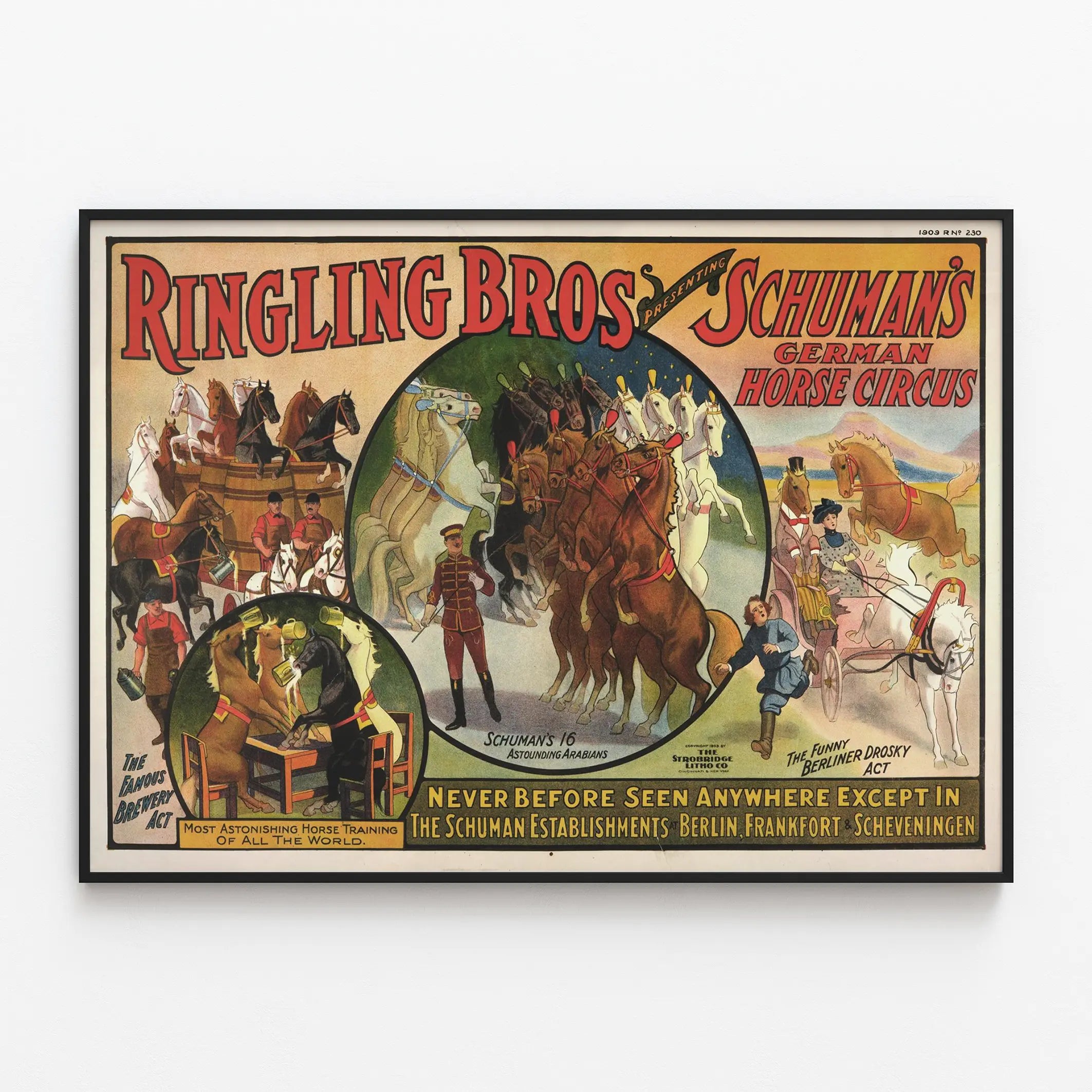 Vintageposter Ringling Bros Schuman's Tyska hästcirkus 1909