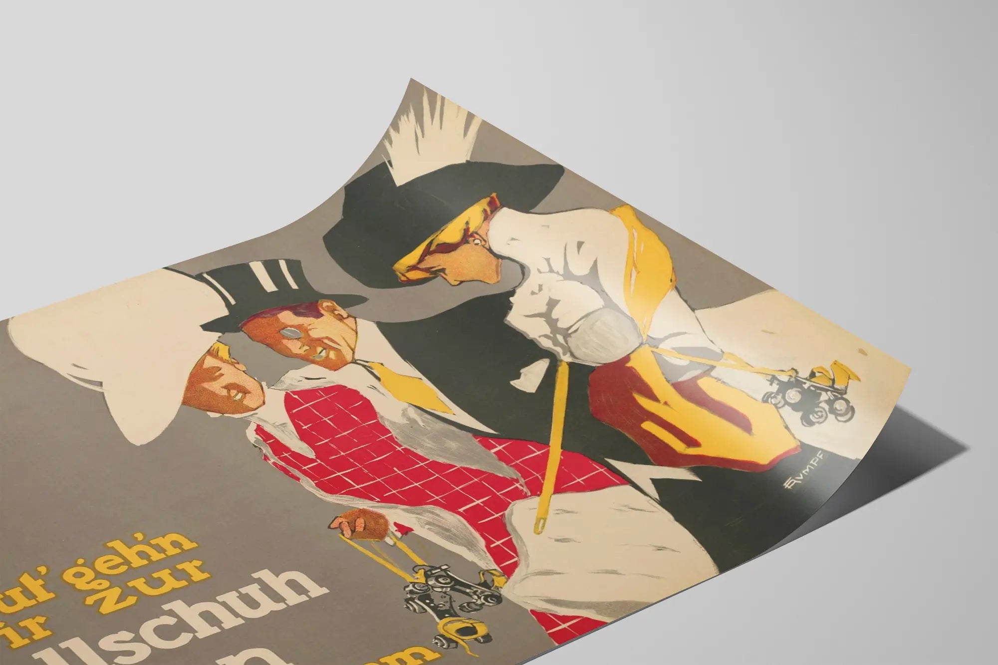 Den här fängslande vintageaffischen med titeln « Heute gehen wir zur Rollschuh Bahn Kurfürstendamm » är ett unikt väggdekorationselement som tillför en retro och elegant touch till varje inredning. Bilden visar tre personer klädda med finess, vilket framkallar en sofistikerad och festlig atmosfär, vintage och urban. Närvaron av rullskridskor i personernas händer understryker det dynamiska och lekfulla temat i dekorationen, perfekt för entusiaster av tidsenliga fritidsaktiviteter och grafisk konst.