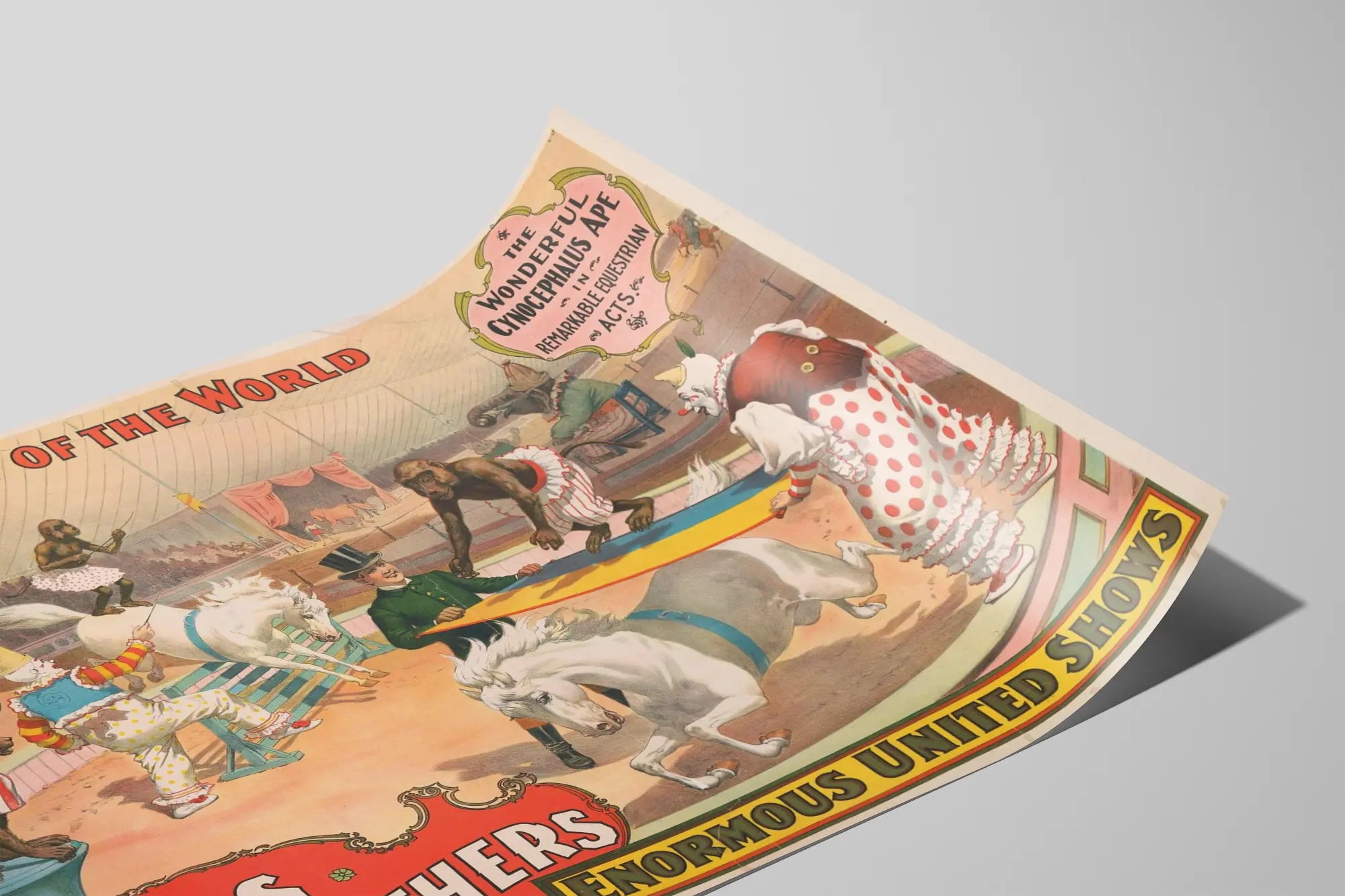 Denna originella vintageaffisch visar hästshowen av Sells Brothers, med titeln « The Big Show of the World ». I centrum, utför cynocefaliska apor i färgglada kostymer imponerande akrobatik med vita hästar i en livlig cirkusmiljö. Bilden illustrerar ett förvånande nummer där aporna rider och hoppar över hinder, ackompanjerade av kostymklädda clowner, vilket tillför humor och fantasi till föreställningen. Denna väggdekoration skiljer sig genom sina livfulla färger och sin typiska retrostil som är karakteristisk för scenaffischer från början av 1900-talet. Perfekt för att skapa en vintage och originell atmosfär i ett inre, är detta väggbild ett utmärkt val för entusiastiska samlare av cirkus- eller djurtema. Den dynamiska kompositionen och de noggrant utarbetade detaljerna ger ett unikt visuellt intryck, vilket gör denna affisch till ett fascinerande dekorativt inslag. Oavsett om det är för en samling av gamla affischer eller för att försköna ett vardagsrum, ett kontor eller ett fritidsrum, fångar detta tryck essensen av traditionella hästshower och den pittoreska världen av forna cirkusar. Dess stil väcker nostalgi och påminner om den kulturella betydelsen av turnerande föreställningar i underhållningens historia. Denna affisch är ett utmärkt exempel på konstnärlig dekorationsaffisch som lyfter fram cirkustemat och tränade djur, perfekt för att berika en vägg med en touch av originalitet och historia.