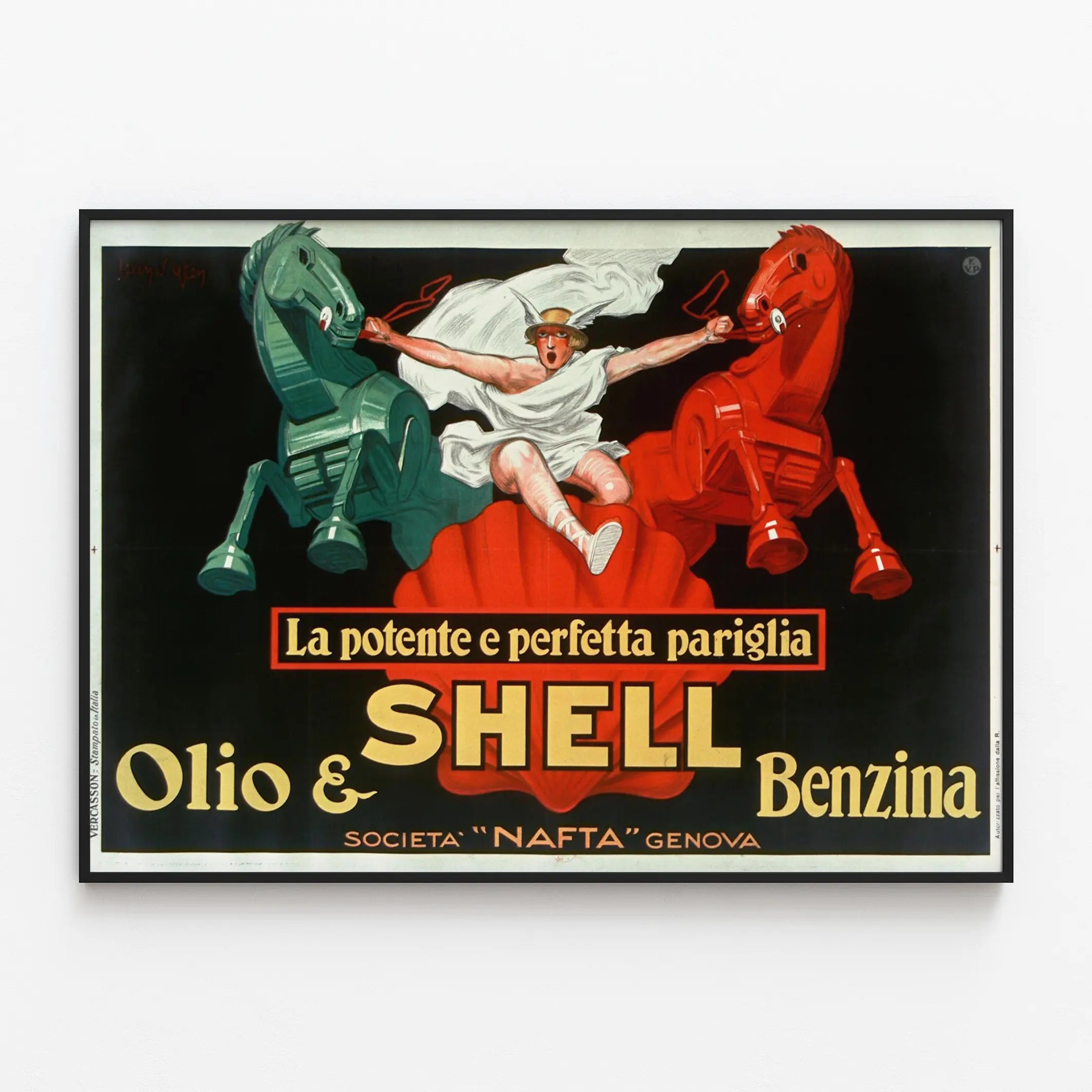 Den här vintageaffischen från Shell lyfter fram kraften och perfektionen hos det italienska märket för olja och bensin. Illustrerad med en ikonisk grafik visar den en central figur klädd i vitt mellan två stiliserade mekaniska hästar, en grön och en röd, som symboliserar drivkraften. Den mörka bakgrunden kontrasterar mot de livfulla färgerna på huvuddelarna och ger denna väggdekoration ett starkt visuellt intryck. Denna affisch är perfekt för en retro- eller industriell atmosfär, idealisk för entusiaster av vintageväggdekoration, gamla affischer eller reklamposters. Den utgör en originell tavla som tillför karaktär och historia till ett vardagsrum, kontor, garage eller utrymme för bilentusiaster. Uttrycket "Olio & Benzina" påminner om användningen av Shells produkter och understryker temat för bränsle och mekanik. Användningen av denna affisch som dekorativt element skapar en dynamisk och suggestiv effekt, som lyfter fram både den grafiska estetiken och nostalgin för gamla reklamer. Denna dekorativa poster är ett utmärkt val för att berika en vägg med ett konstnärligt och historiskt föremål, som tilltalar både samlare och vintage-designentusiaster.