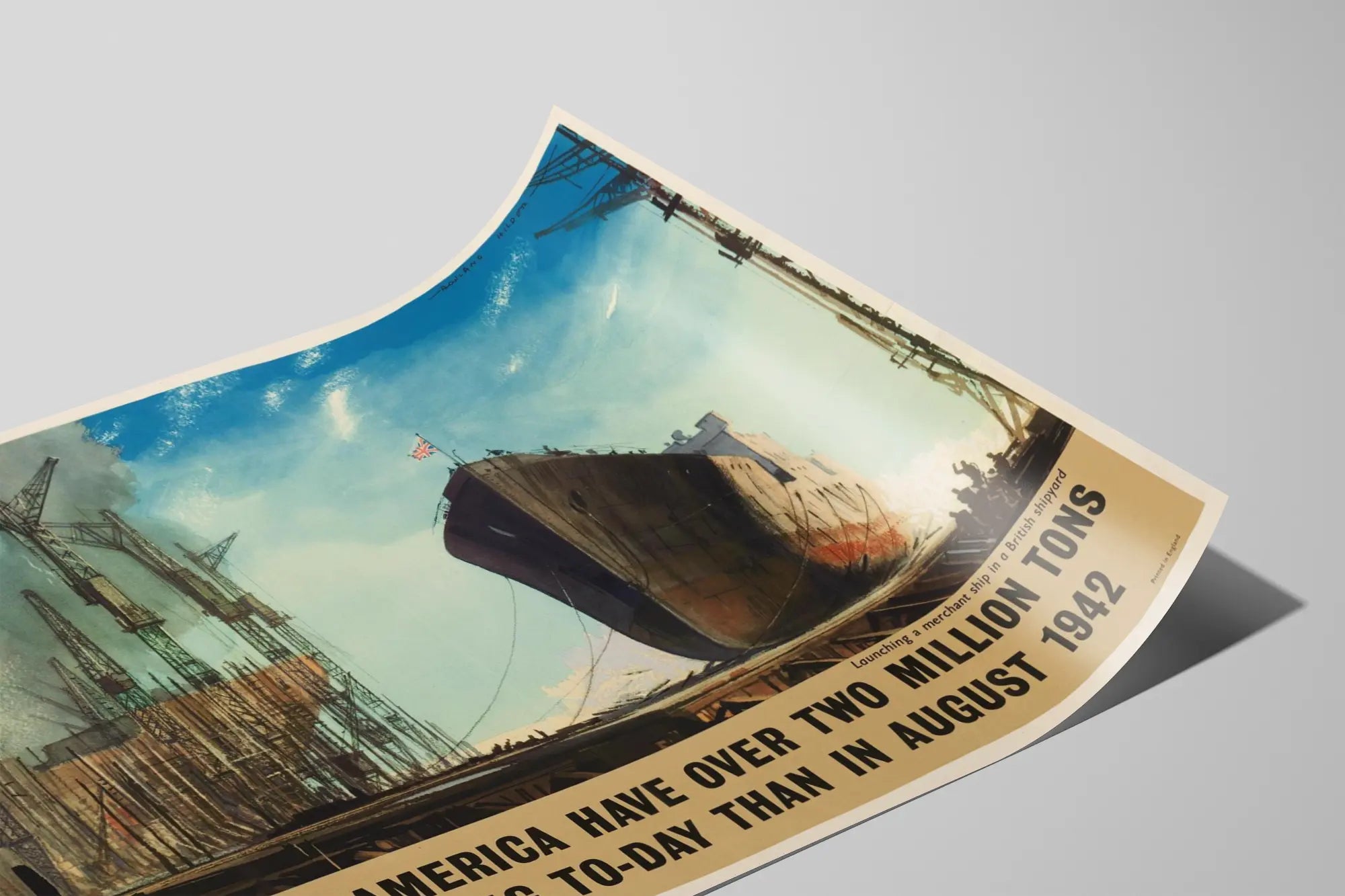 Den här vintageaffischen illustrerar med glans lanseringen av ett handelsfartyg vid en brittisk varv, och lyfter fram den betydande vikten av Storbritanniens och USA:s maritima flottor. Detta väggdekorationstycke fångar blickar med sina nyanser som blandar himmelsblått och grå rök, symboliserande både industriell styrka och det maritima historiska sammanhanget. Affischen visar ett stort fartyg som just sjösätts, stolt med den brittiska flaggan högst upp, omgiven av många imponerande kranar vid en byggnadsplats. Denna väggdekoration riktar sig till alla som älskar maritim historia, sjöfartsindustri och retrokonst, och som vill pryda sitt hem med en äkta affisch fylld av starka symboler. Kontrasten mellan det imponerande fartygets silhuett och den detaljerade strukturen av kranarna skapar en levande tavla som vittnar om krigsinsats och den industriella kapaciteten hos båda nationerna. Perfekt för ett kontor, vardagsrum eller bibliotek, erbjuder denna vintageaffisch en atmosfär som är både nostalgisk och dynamisk, idealisk för att förhöja varje vägg med en historisk touch. Bilden framhäver också en stark typografi längst ner, som visar överlägsenheten i tonnage för fartyg i tjänst 1943 jämfört med 1942, vilket ger tavlan en informativ och dekorativ dimension. Denna väggdekoration passar perfekt in i en industriell, modern eller klassisk miljö, och tillför ett element av mod och minne kring det maritima temat. Affischen utmärker sig med en omsorgsfull grafisk stil, som kombinerar illustration och målerisk realism, vilket gör den till ett dekorativt föremål som är både estetiskt tilltalande och suggestivt. Den möjliggör att ge karaktär åt en vägg och ger liv åt en historisk sida, samtidigt som den erbjuder en enastående visuell kvalitet.