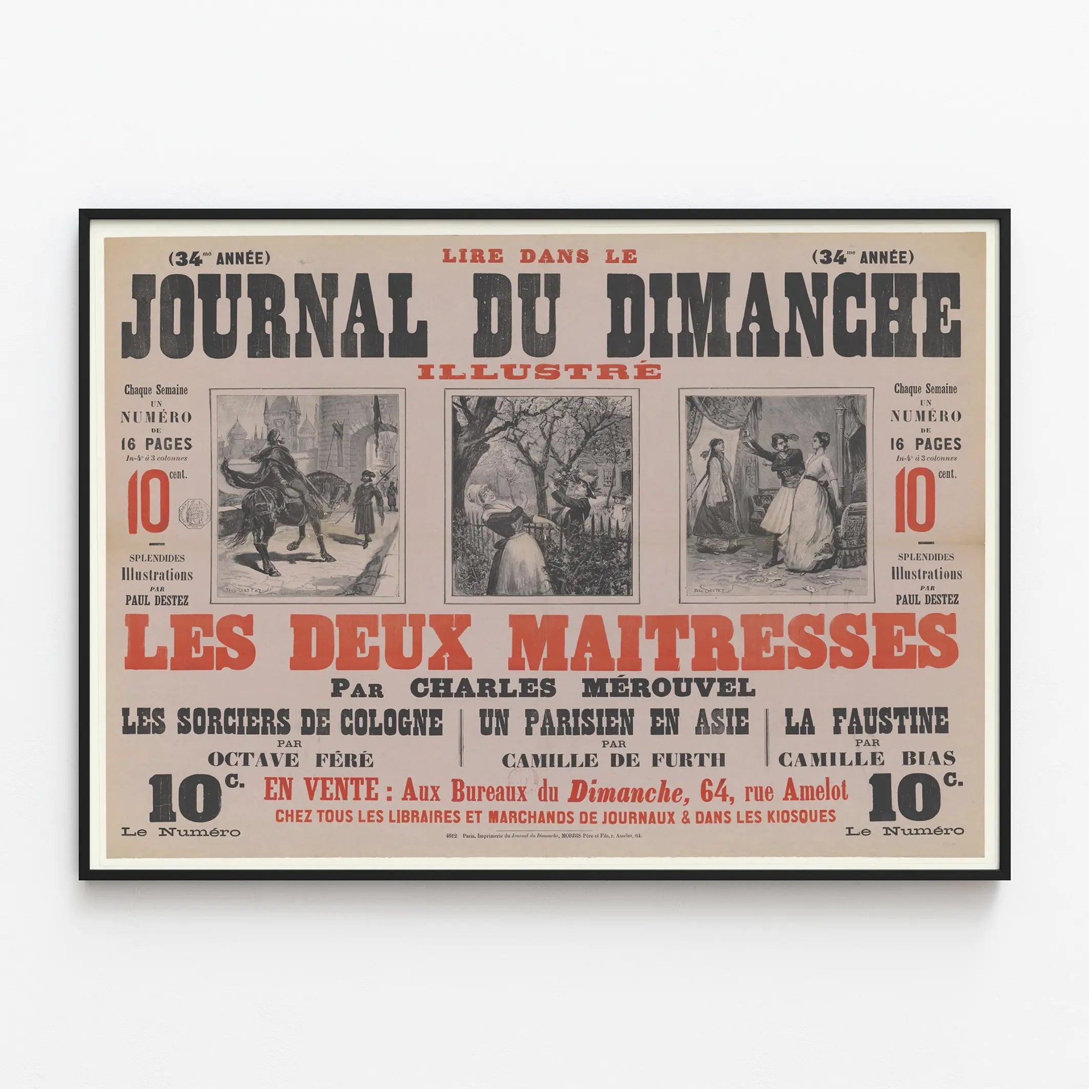 Denna vintageaffisch från Journal du Dimanche Illustré lyfter fram publiceringen av "Les Deux Maîtresses" av Charles Mérouvel. Denna väggdekoration med retroinspiration visar en stark typografisk design med titeln i versaler och svartvita illustrationer inramade, signerade Paul Destez. Den framkallar atmosfären från de illustrerade tidningarna i början av 1900-talet, perfekt för entusiaster av historisk väggdekoration och samlare av gamla litografier. Affischformatet framhäver den typiska grafiska stilen från epoken, med en skicklig blandning av svart och rött textmaterial, som estetiskt och kraftfullt framhäver titlar och information. Detta dekorativa föremål kan få en perfekt plats i ett vardagsrum, ett kontor eller ett bibliotek, och tillför en känsla av äkthet och vintagecharm till ditt hem. Visa detta konstverk för att lyfta fram ett retroinspirerat inre eller för att samla ikoniska grafiska element från det franska tryckarvet. Denna väggdekoration är ett vackert hyllning till historisk journalistik och konstnärlig illustration, där text och bild kombineras i en noggrant balanserad komposition.