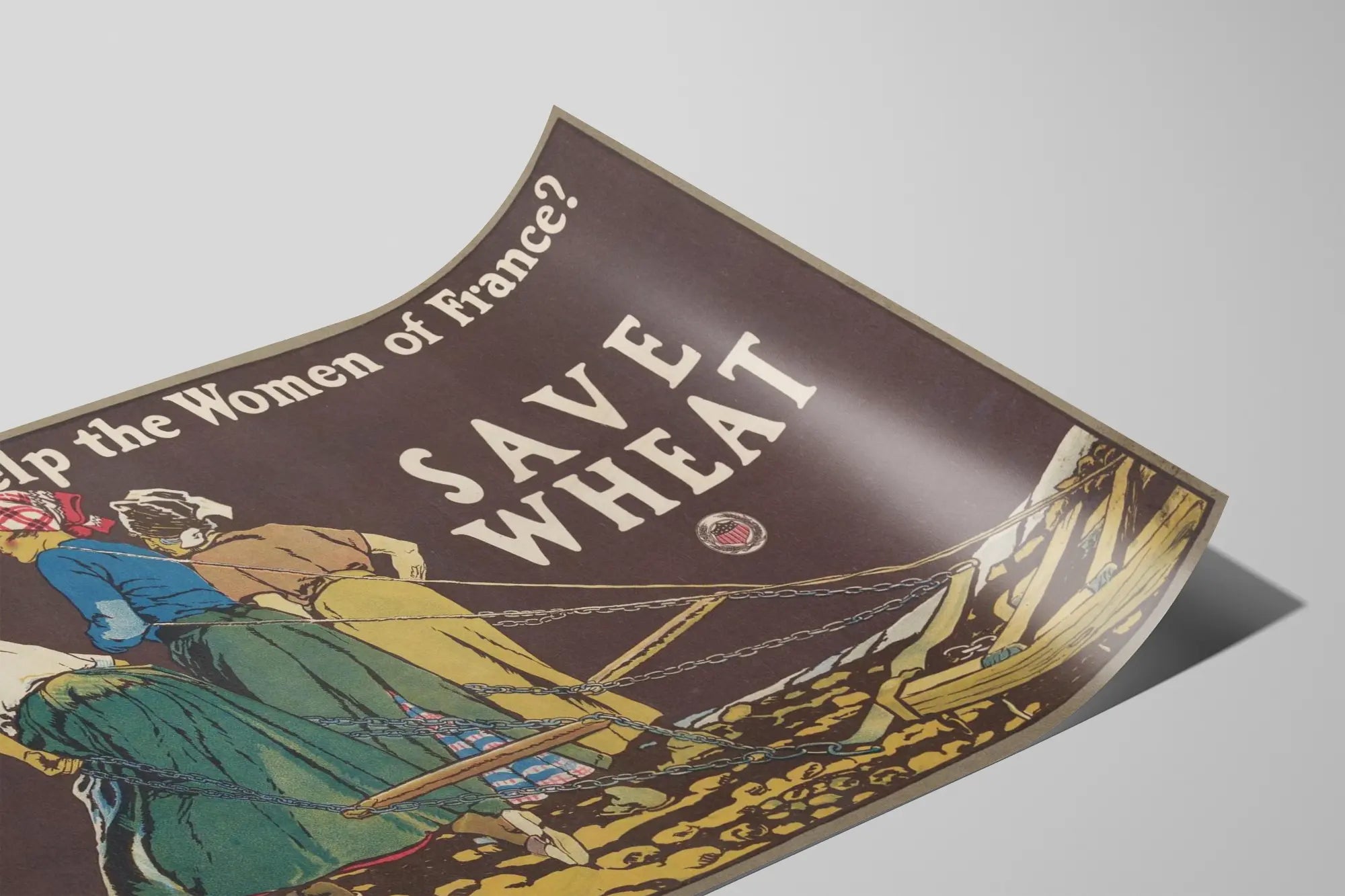 Det är också en kulturell och social uttrycksfull affisch, som särskilt hänvisar till perioden då kvinnor tog en mer aktiv roll inom jordbruket, vilket stärker kvinnans roll i traditionellt manliga sektorer. Genom att visa denna poster integrerar du ett dekorativt föremål med ett kraftfullt och historieberättande budskap. Den engelska inskriptionen « Will you help the Women of France? Save Wheat » inbjuder till reflektion kring kollektivt stöd och bevarande av livsmedelsresurser.
