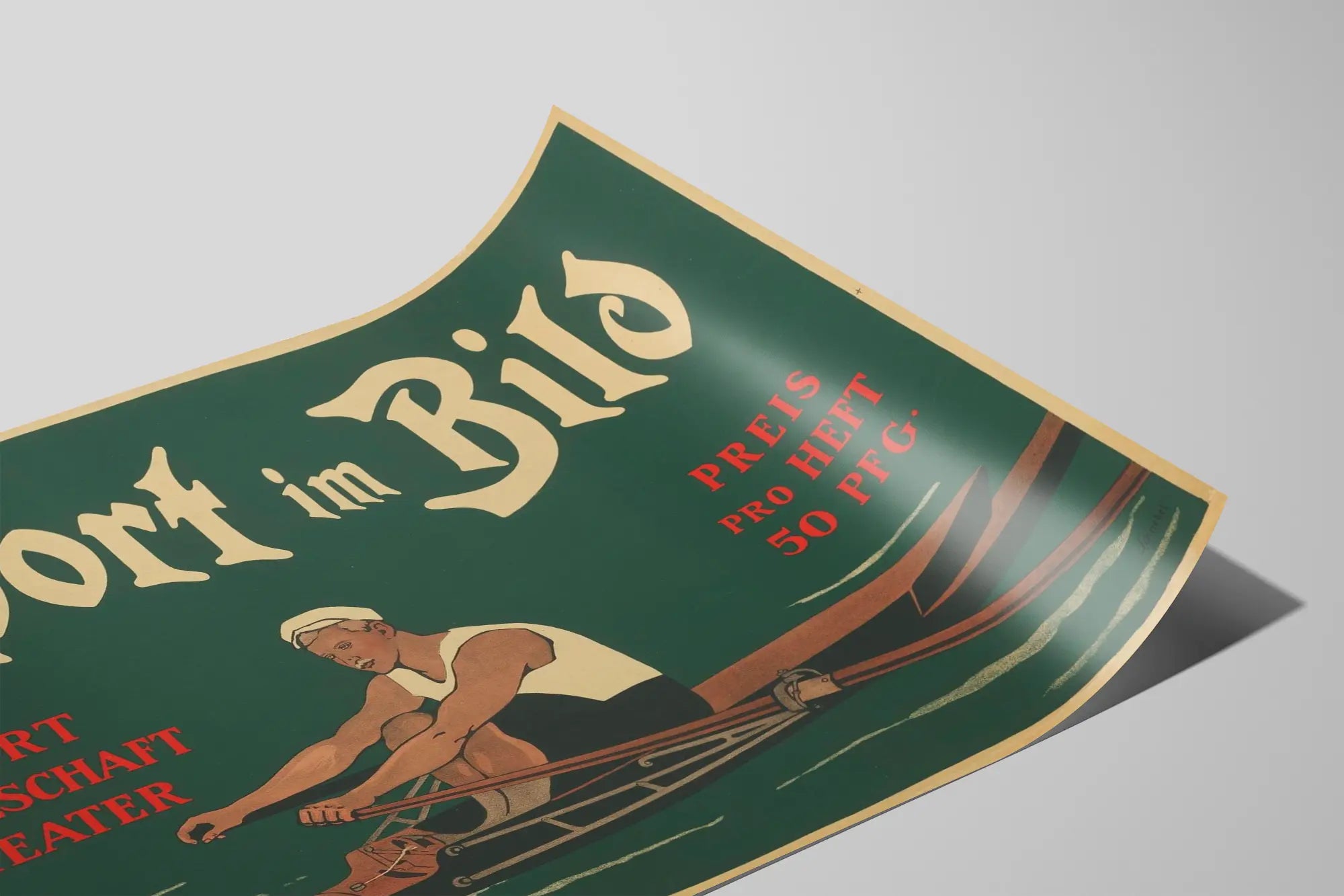 Denna vintageaffisch med titeln "Sport im Bild" är ett unikt väggdekorationsstycke som föreställer en roddare i full fart. Med en mörkgrön bakgrund och inskriptioner i gamla vita och röda bokstäver väcker affischen en subtil blandning av sport, samhälle och teater. Det centrala motivet i denna väggdekoration är en man klädd i traditionell roddklädsel, illustrerad i en grafisk stil som påminner om affischer från de första decennierna av 1900-talet. De dämpade men kontrasterande färgerna förstärker den retro och eleganta känslan, vilket gör den till ett perfekt affisch för den som vill tillföra en sportig och konstnärlig touch till sitt hem. Perfekt för sportentusiaster och vintageälskare, passar denna affisch lika bra i ett gym, ett vardagsrum eller ett kontor. Dess gamla typografi och enkla motiv gör den till ett fängslande dekorativt konstföremål med historia. Oavsett om det är för en samling sportaffischer eller för att dekorera ett utrymme för rörelse och prestation, utgör denna vintageaffisch med roddare ett originellt och tidlöst dekorativt inslag.