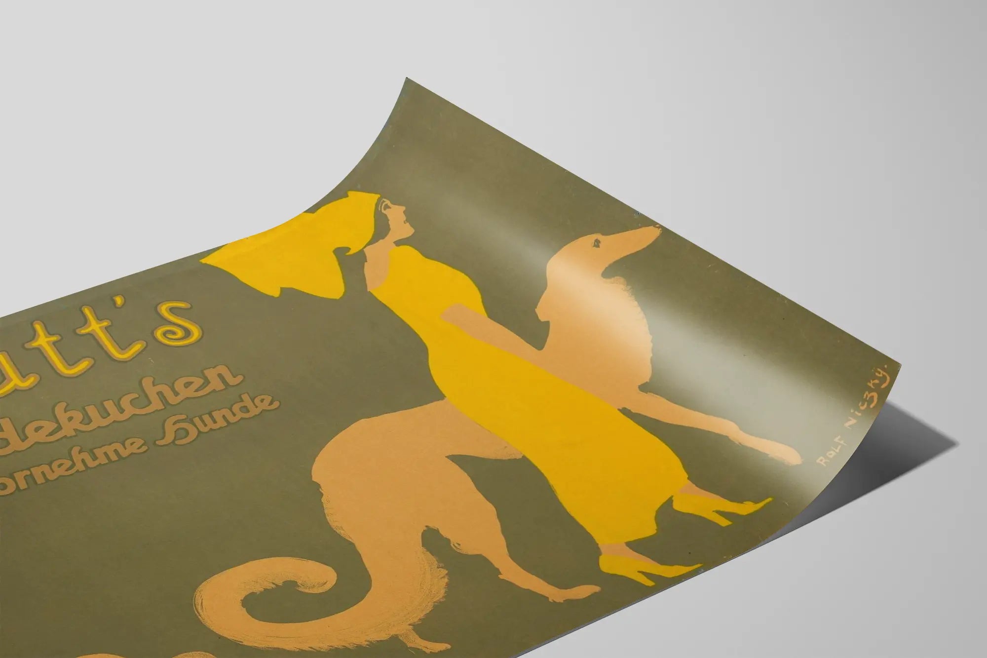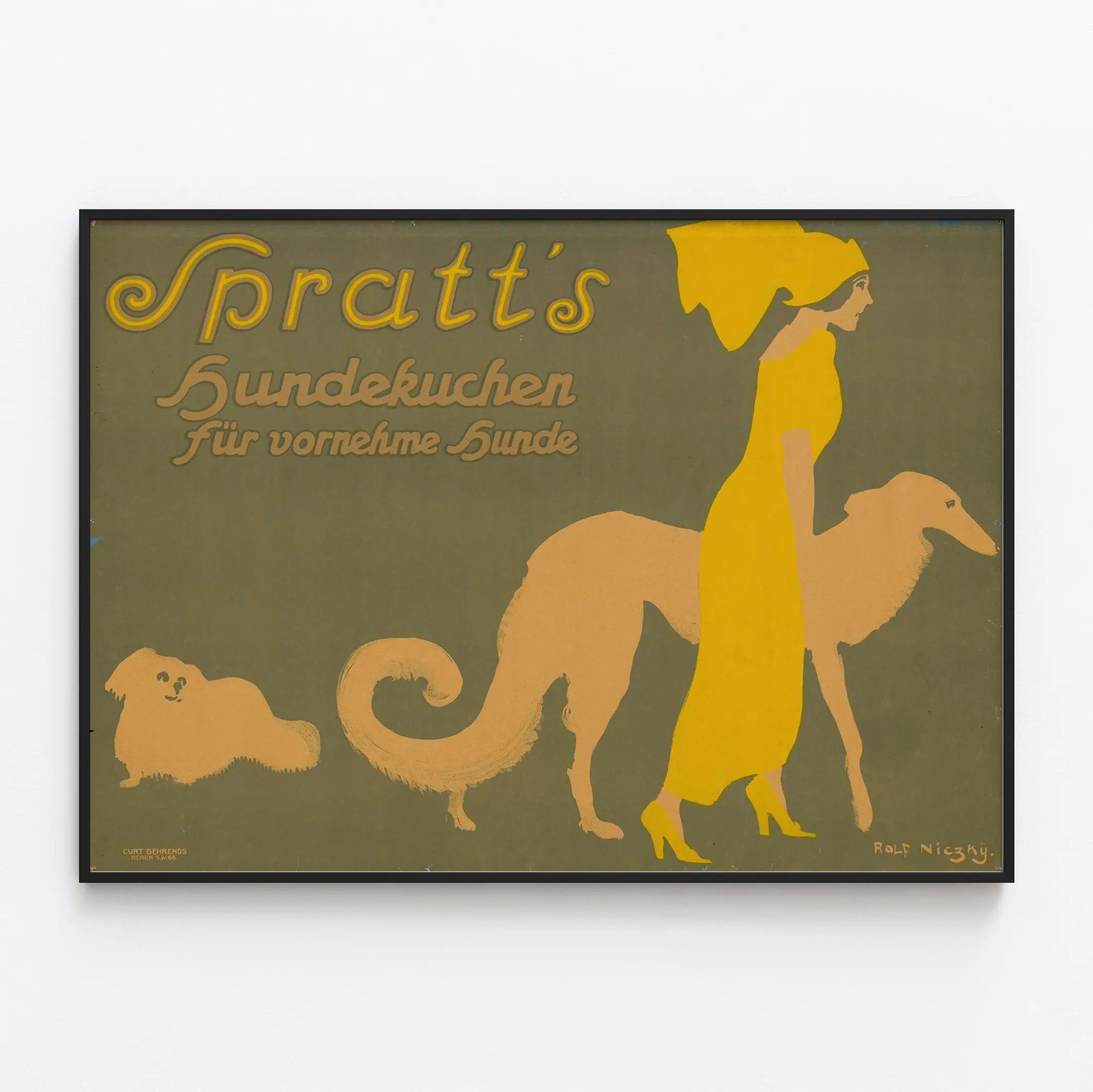 Denna vintageaffisch för Spratt's Hundekuchen fångar uppmärksamheten med sin enkla design och sitt unika retro-ton, perfekt för en originell väggdekoration. På en kaki-färgad bakgrund visar en minimalistisk och ren grafisk form en elegant kvinnlig siluett klädd i stark gul färg, tillsammans med två hundar i stiliserade former, vilket skapar en slående färgkontrast. De varma nyanserna av gult och beige framhävs kraftfullt mot bakgrundens enkelhet. Texten uppe till vänster, skriven i art déco-typografi, annonserar "Spratt's Hundekuchen för förnäma hundar", vilket understryker affischens eleganta och sofistikerade atmosfär. Denna balanserade komposition mellan mänskliga och hundlika element ger en äkta retrocharm, idealisk för konstälskare och samlare av gamla reklamaffischer. Upphängd i ett vardagsrum, sovrum eller väntrum, tillför denna affisch en distinkt och klassisk prägel till vilket utrymme som helst. Den passar lika bra för samlare som för designentusiaster och hundälskare. Formatet och den retroinspirerade stilen passar perfekt i moderna interiörer som söker ett väggdekorelement som är både estetiskt tilltalande och suggestivt. Skäm bort dig själv eller ge bort detta originella visuella reklömarbete, en symbol för en elegant och originell vintage-stil.