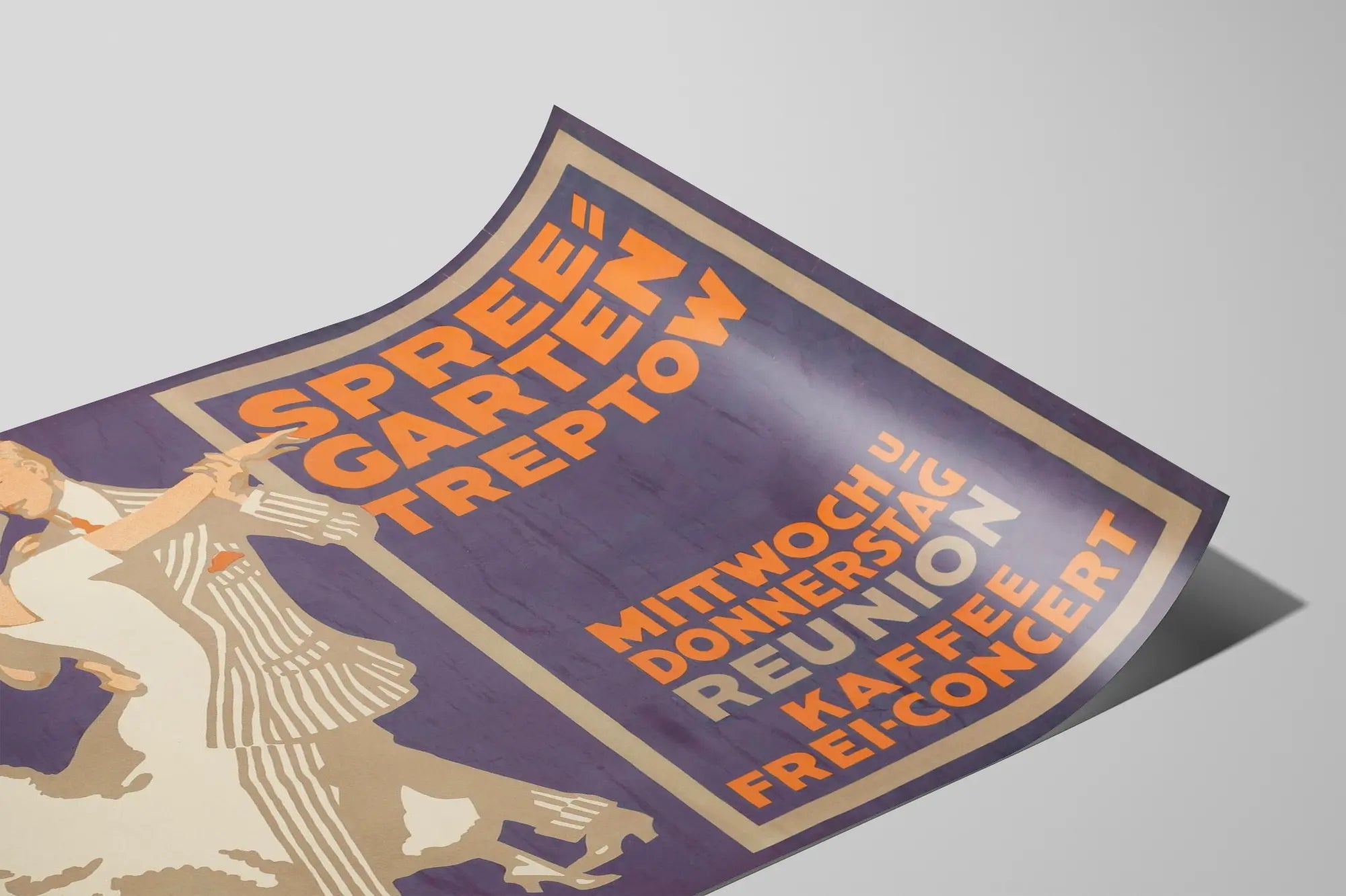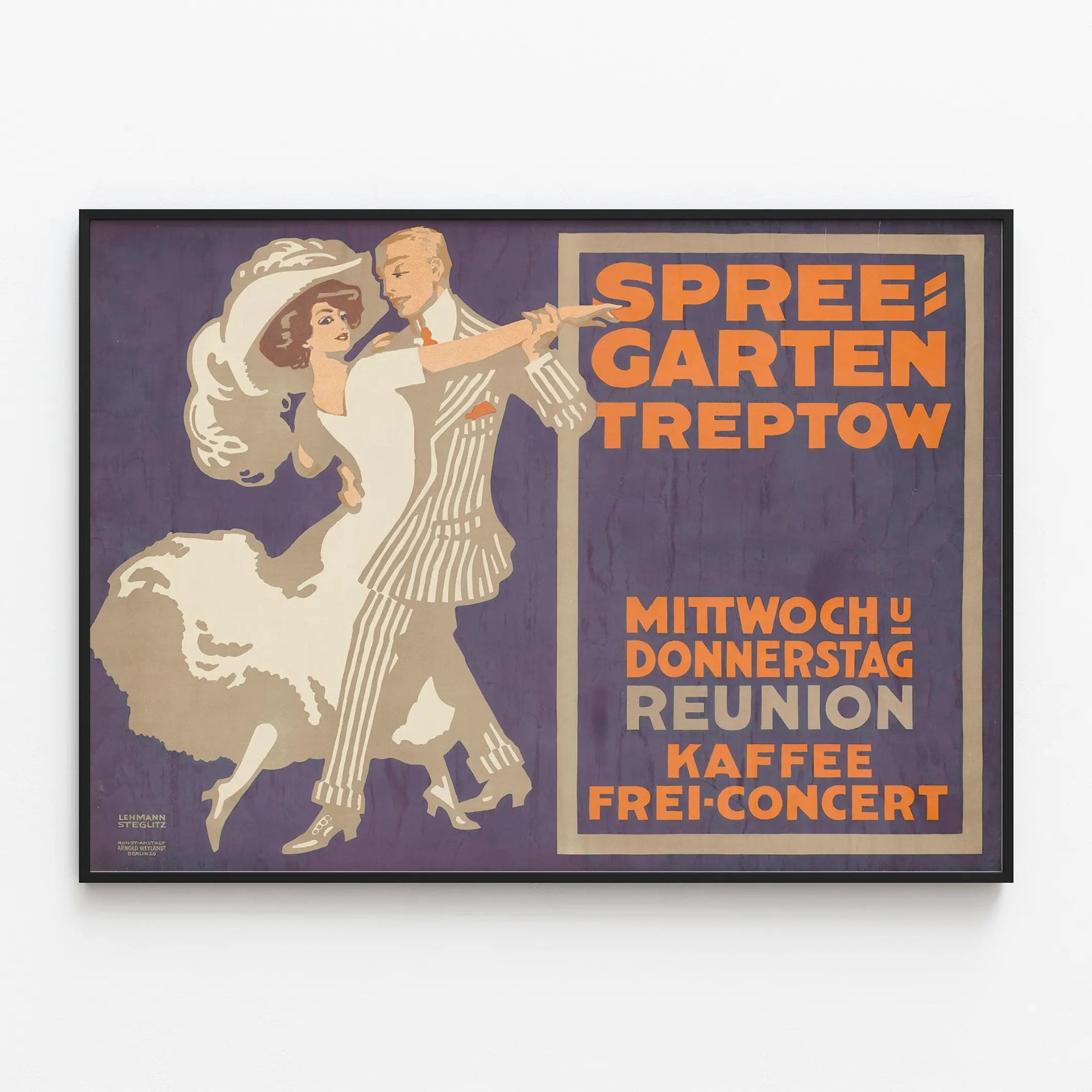 Upptäck denna vintageaffisch i elegant retrostil, konstnärligt illustrerad, perfekt för en originell väggdekoration. Den skildrar ett dansande par, klädda i en klassisk stil från förr, med en kvinna i vit klänning och en man i randig kostym, som förkroppsligar den festliga och förfinade atmosfären vid danskvällar. Denna reklampostern annonserar ett evenemang vid Spreegarten Treptow, en kultur- eller nöjesplats. Texten på tyska tydligt visar veckodagarna "Mittwoch" och "Donnerstag" (onsdag och torsdag), samt orden "Reunion", "Kaffee" (kaffe) och "Frei-Concert" (gratis konsert), vilket antyder ett regelbundet möte med musik och gemytlighet.