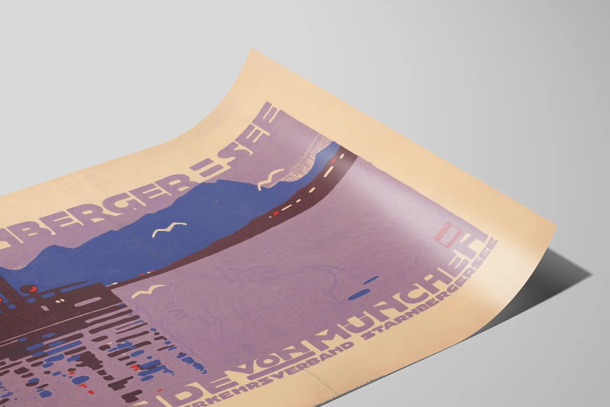 Denna dekorativa vintageaffisch visar en stiliserad vy över Starnbergsjön, belägen en halvtimme från München, och är ett perfekt val för den som vill berika sin väggdekoration med en retro och konstnärlig touch. Designen framhäver minimalistiska former och dominerande färger i lila och blått, som framkallar silhuetten av sjön och fjällen i horisonten, samt flygande fåglar, vilket skapar en lugn och naturlig atmosfär. Den grafiska sammansättningen inkluderar geometriska element och kraftfull typografi, kännetecken för gamla reseaffischer, som drar blickarna till sig samtidigt som de inbjuder till flykt. En båt glider lugnt över vattnet, vilket understryker sjöns betydelse inte bara som ett naturreservat utan också som en tillgänglig turistdestination från München, en stad nära detta ikoniska område. Denna affisch kan finnas som poster eller väggbild, och smälter harmoniskt in i olika inredningsstilar, oavsett om det är i ett vardagsrum, ett sovrum eller ett kontor, för att subtilt framhäva charmen hos alpina landskap och den vackra naturen i Tyskland. Den riktar sig till entusiaster av vintage grafisk konst, till naturtematiska väggdekorationer eller samlare av turistaffischer. Enkelheten i dess grafiska uttryck, kombinerad med en lugnande färgpalett, skapar en varm och inspirerande atmosfär i ditt utrymme. Denna poster kan också komplettera en samling av rese- eller landskapsaffischer från Europa, och tillföra en historisk och kulturell dimension till din inredning. Slutligen, tack vare sin unika stil, blir denna vintageaffisch av Starnbergsjön både ett dekorativt föremål och en intressant samtalsstart, som inbjuder dina gäster att upptäcka denna pittoreska region nära München.