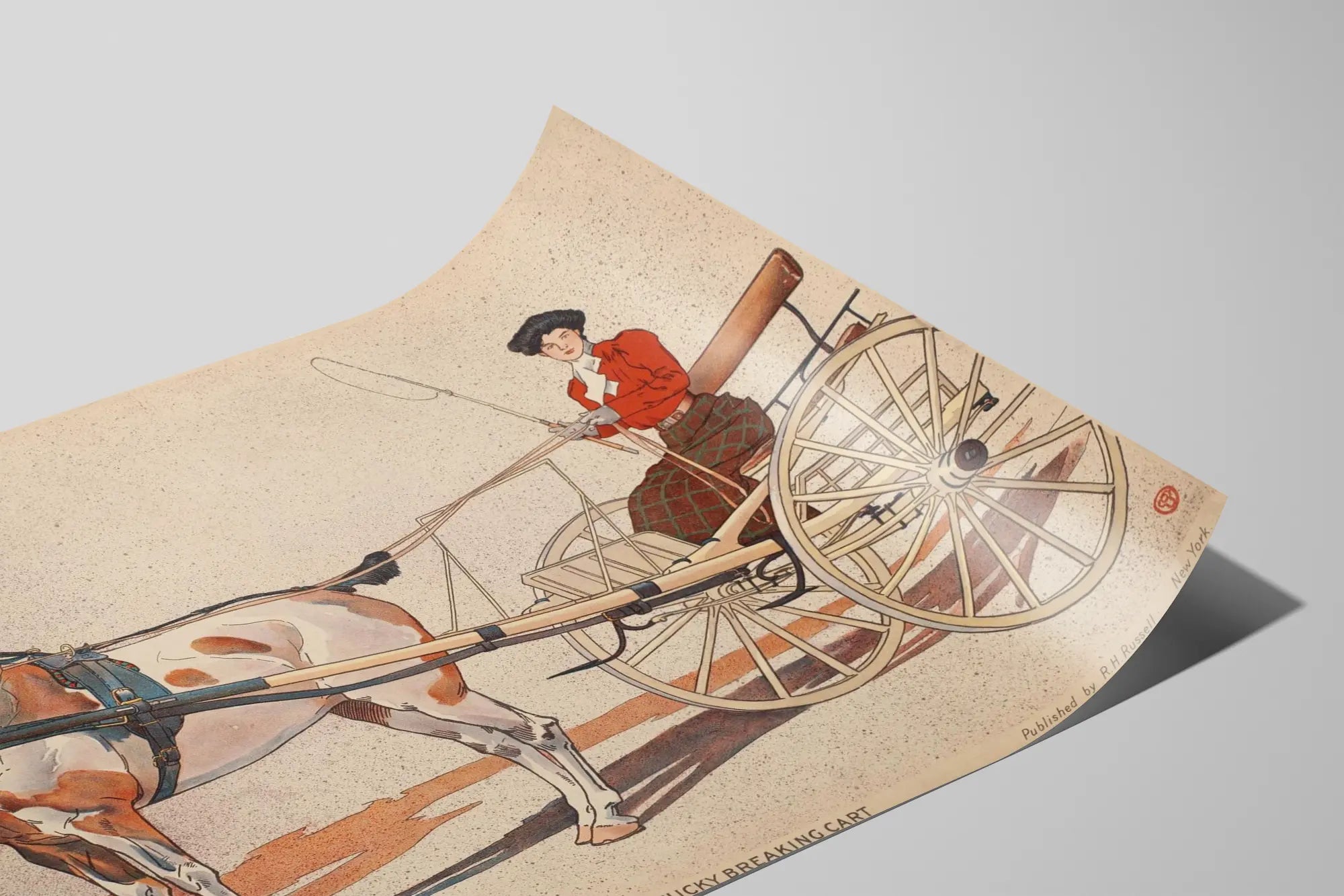 Upptäck denna eleganta vintageaffisch med titeln "A Kentucky Breaking Cart", ett unikt väggdekorationselement som hyllar konsten från början av 1900-talet. Denna fina och detaljerade illustration skildrar en typisk landsbygdsscen med en häst som är kopplad till en lätt vagn, kallad "breaking cart", typisk för Kentucky. Den finstämda linjeteckningen och den mjuka färgpaletten med inslag av brunt, beige och rött ger denna affisch en äkta och nostalgisk charm.