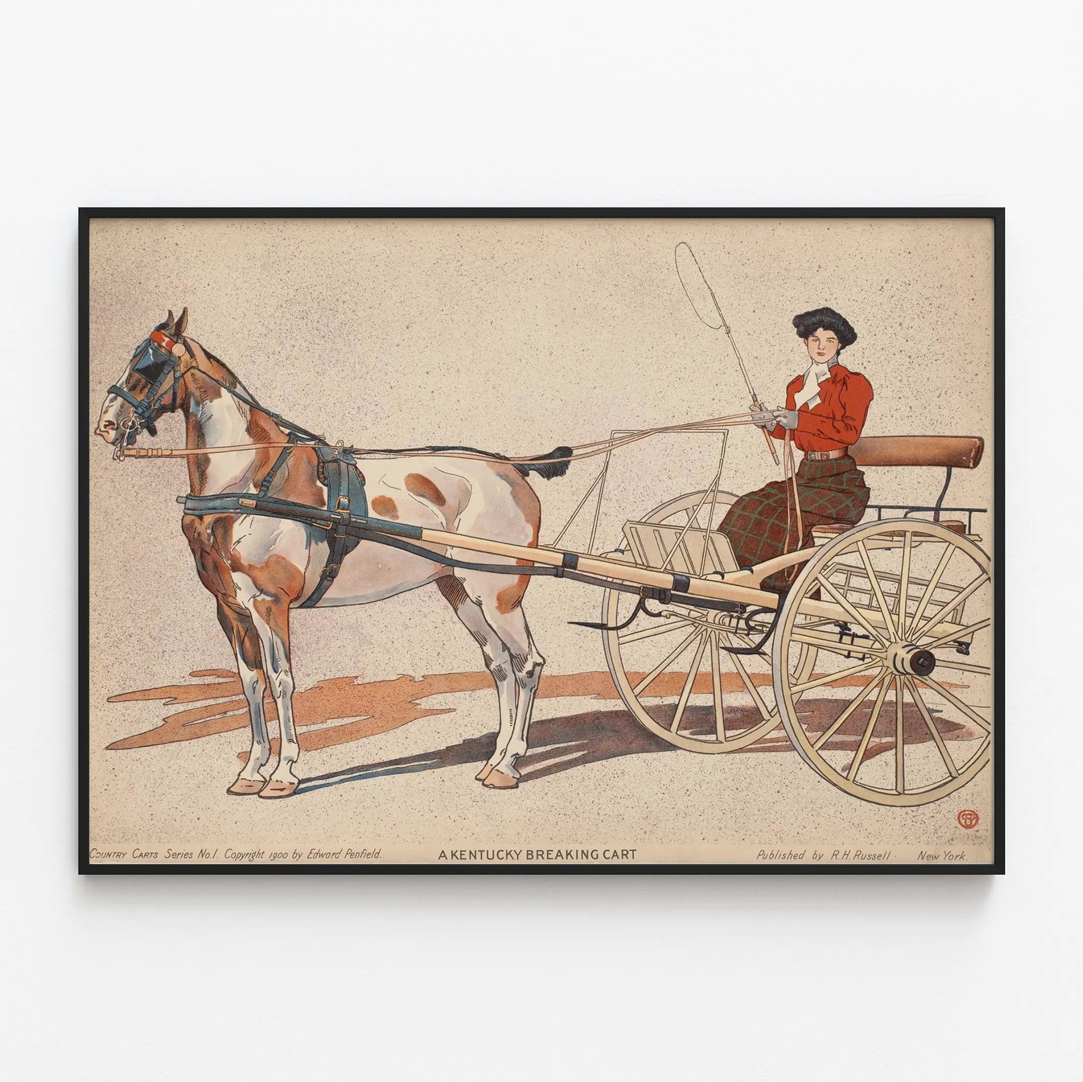 Affischen "A Kentucky Breaking Cart" fångar en scen ur det amerikanska landsbygdslivet, uttryckt med enastående grafisk skicklighet. Bilden visar tydligt de typiska elementen för denna typ av hästdragning, inklusive de stora trähjulen, selningens draglinor och tidstypiska kläder, vilket gör den till ett samlarobjekt för historie- och konstälskare.