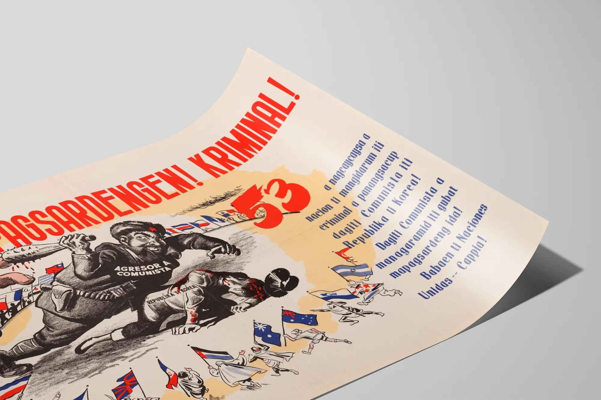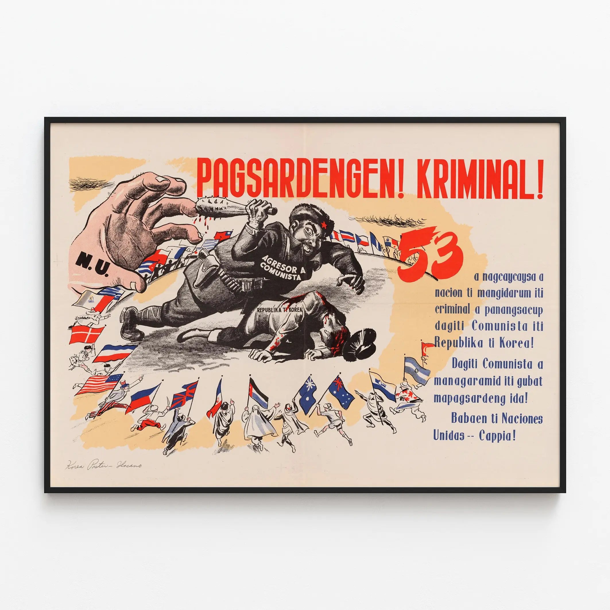 Den här vintageaffischen visar en stark och engagerande illustration som passar som väggdekoration i en historisk och politisk stil. Den föreställer en dramatisk scen där en karikatyrartad figur i uniform, identifierad som en « kommunistisk angripare », hotar en annan person som ligger på marken, märkt med inskriften « Republika ti Korea ». Affischens atmosfär förstärks av användningen av röda och svarta färger, symboler för nödläge och fara, kombinerat med en ljusbeige bakgrund som framhäver huvudmomenten med intensitet.