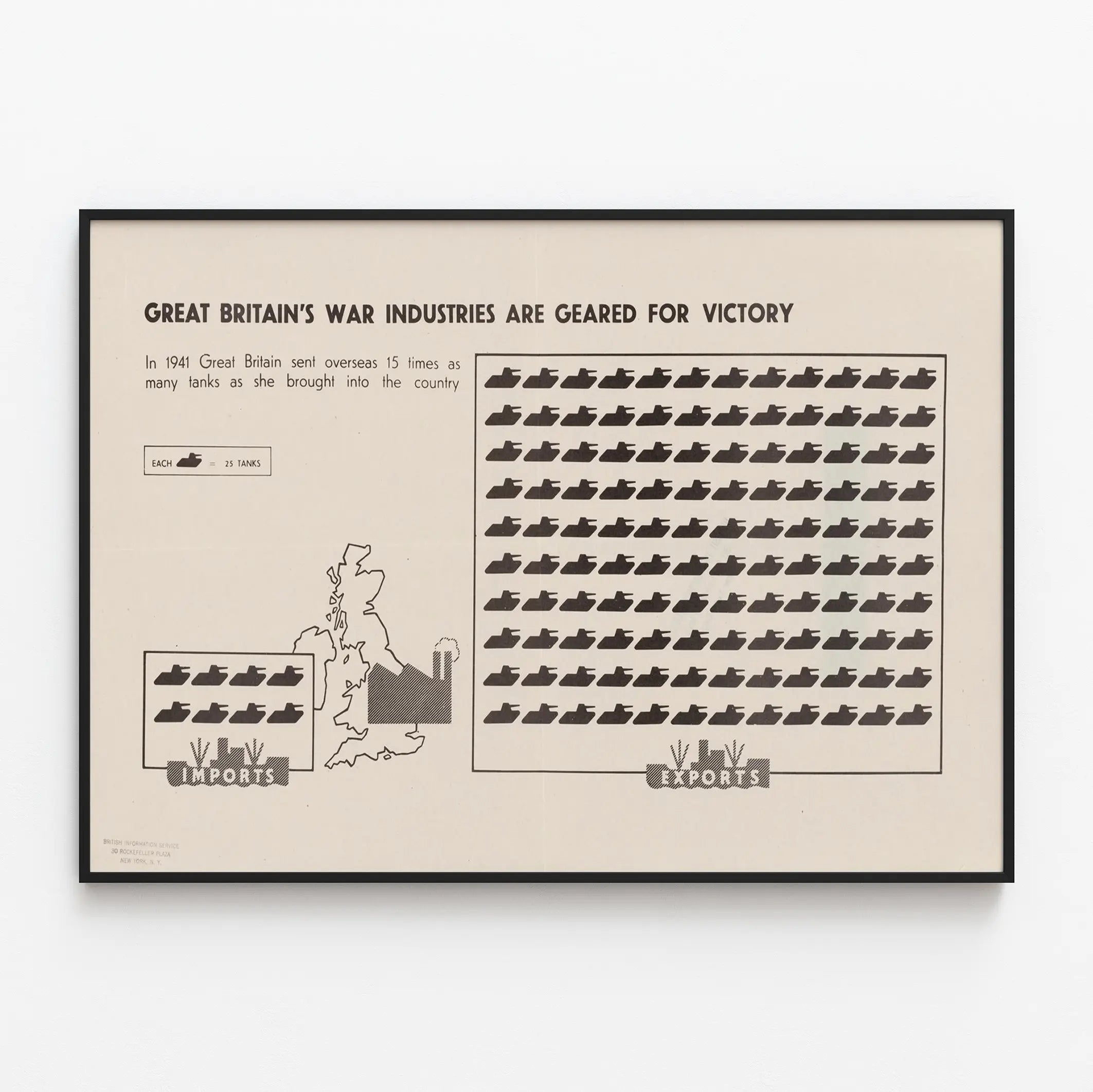 Denna vintageaffisch lyfter fram den brittiska krigsindustrins kraft 1941, med en graf som illustrerar produktion och export av stridsvagnar. På en ljus bakgrund visar två ramar visuellt antalet importerade och exporterade stridsvagnar av Storbritannien. Varje ikon i form av en stridsvagn symboliserar 25 fordon, vilket gör det enkelt att visualisera den imponerande mängden militärutrustning som producerades av landet under denna period. Texten högst upp anger att Storbritannien skickade utomlands femton gånger fler stridsvagnar än de importerade, vilket understryker landets industriella kapacitet riktad mot seger. Denna svartvita affisch har en minimalistisk och informativ stil som passar perfekt som väggdekoration i en industriell eller retroinspirerad interiör. Den är idealisk för militärhistorieentusiaster eller för dem som vill integrera grafiska och pedagogiska element i sin inredning. Detta poster kombinerar vintageestetik med tydlig visuell information, och skapar en originell bild som avslöjar ett avgörande ögonblick i industri- och militärhistoria. Perfekt för ett kontor, ett bibliotek eller ett vardagsrum, ger denna affisch karaktär och en känsla av äkthet till vilken vägg som helst, samtidigt som den berättar en stark historia genom en enkel men uttrycksfull grafisk framställning.