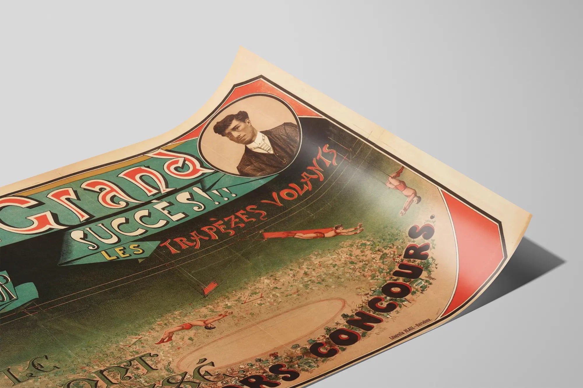 Denna vintageaffisch illustrerar en luftakrobatföreställning med titeln « Storslaget Framträdande De Flygande Trapetsen » av Liop-bröderna. Denna väggdekoration visar en cirkusmiljö sett i perspektiv, med flera trapetskonstnärer i full fart i mitten av en åskådarkrets. Den dynamiska scenen lyfter fram akrobater i röda kostymer, som utför luftfigurer ovanför publiken och fångar energin och spänningen i trapetsshowen. De två porträtten på oval bakgrund högst upp på affischen föreställer troligen de två artisterna, Liop-bröderna, vilket understryker deras vikt i föreställningens uppsättning. Texten i stiliserad stil, med orden « Storslaget Framträdande!!! De Flygande Trapetsen » samt « Den Bräckliga Bro » och « Utan Konkurrens », ger affischen en äkta och retro känsla. Denna typ av affisch är ett perfekt inslag för en originell väggdekoration, som kombinerar konst och historia från scenkonsten. Den passar utmärkt i ett vintage- eller industriellt inrett hem, och tillför en känsla av äventyr och tidsenlig charm. Oavsett om du är cirkusentusiast, affischsamlares eller söker ett unikt element för att försköna dina väggar, blir denna suggestiva affisch ett fängslande dekorativt föremål som tillför färg och berättelse till ditt utrymme. En väggdekoration som väcker magin från traditionell scenkonst till liv, samtidigt som den behåller en anmärkningsvärt gammal grafisk estetik.