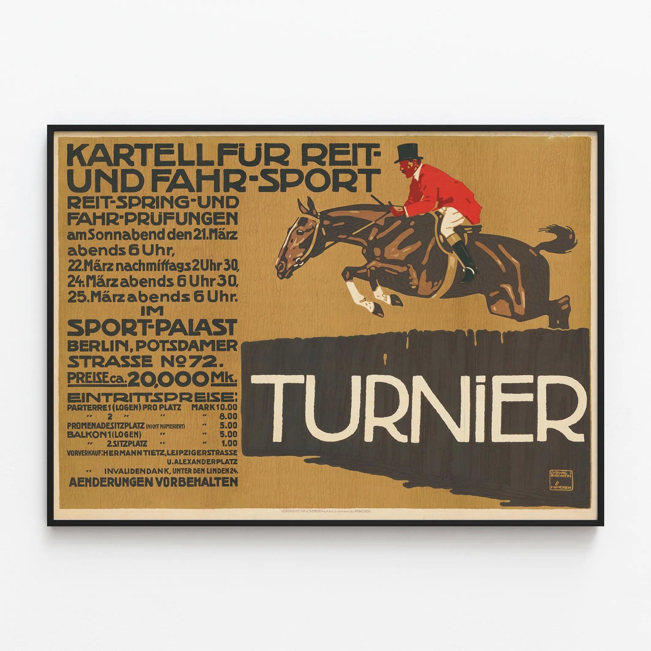 Upptäck denna vintageaffisch som är ägnad åt hästsporttävlingen och visar en dynamisk scen med hinderhoppning. Denna väggdekorationstavla illustrerar en ryttare i traditionell röd och vit klädsel, iklädd en hög hatt, mitt i ett hopp med sin bruna häst. Bakgrunden är beige med ett diskret mönster, vilket framhäver texten i svarta och vita versaler som detaljerar information om tävlingen i ridning och körning. Denna sportinspirerade väggdekoration förmedlar både elegans och energi. De svarta typsnitten kontrasterar mot den varma bakgrundstonen och framhäver datum, plats för tävlingen samt praktisk information som priser och adresser. Denna affisch av hög kvalitet fångar andan och atmosfären av historiska hästtävlingar, perfekt för att berika en samling av vintageaffischer eller för att pryda en vägg med ett historiskt uttryck. Denna vintageväggbild passar utmärkt i ett vardagsrum, ett kontor eller ett rum för hästsportintresserade, och utgör ett dekorativt element som är både visuellt och informativt.
