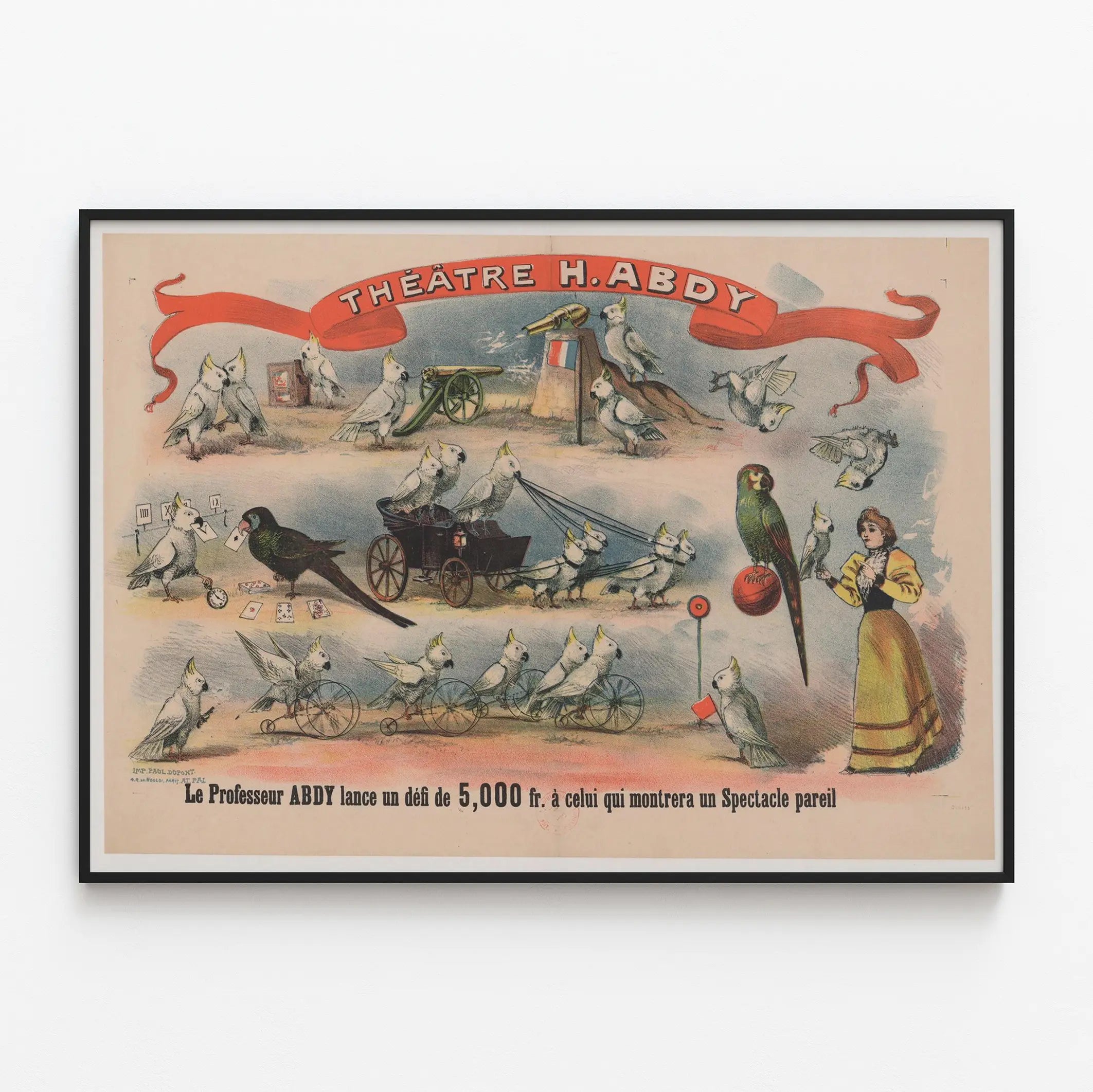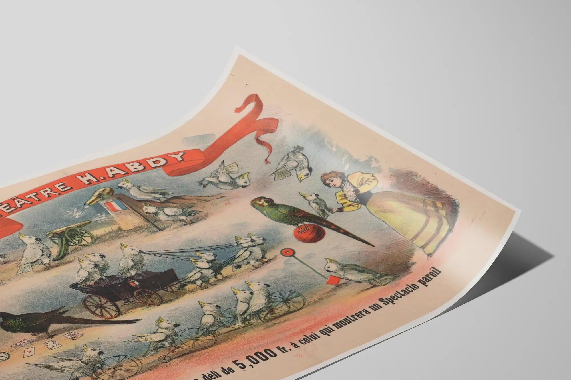 Denna originella vintageaffisch för H. Abdy-teatern illustrerar på ett charmfullt sätt en unik föreställning med skickliga papegojor i olika konstnärliga framträdanden. Teckningen visar en serie livfulla scener där exotiska fåglar, främst vita och färggranna papegojor, utför tricks och manipulerar föremål, vilket skapar en lekfull och överraskande atmosfär. Man kan bland annat se papegojor dra en liten vagn, leka med kort, rulla ett hjul eller hålla en fransk flagga nära ett kanon, vilket understryker en teatral och originell scen. En kvinna i tidsenlig klädsel, troligen fåglarnas mästare, är också närvarande, vilket förstärker den levande teaterkänslan i scenen. Affischen domineras av ett brett rött band upptill med teaterns namn. Längst ner finns en text som utmanar till att anta utmaningen från Professor Abdy, och lovar ett pris på 5000 franc till den som lyckas visa upp en liknande föreställning. Denna poster är ett vackert exempel på vintage väggdekoration som tilltalar konstälskare av gammal grafik och teateraffischer. Dess pastellfärgade palett, blandad med livfulla inslag, ger en nostalgisk touch som är perfekt för att försköna ett inre med retro- och originell atmosfär. Denna väggdekoration passar utmärkt i ett vardagsrum, ett kontor eller ett privat teatersal, och tillför en känsla av elegans och nyfikenhet tack vare sitt djur- och teateruniversum. Perfekt som samlarobjekt eller för att berika en samling av gamla affischer, är denna poster en inbjudan att återupptäcka den fascinerande världen av djurföreställningar från förr.