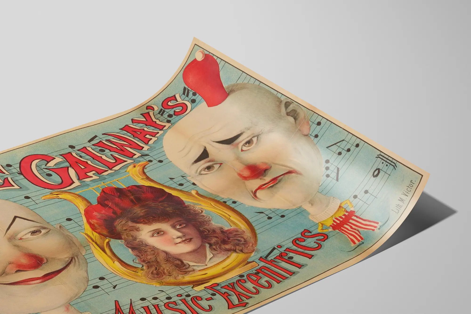 Upptäck denna unika vintageaffisch med titeln « The Galway's Music Excentrics », ett dekorativt föremål som tillför en touch av originalitet och en retrocharm till ditt hem. Denna poster föreställer en smakfullt excentrisk stil, med två manliga figurer med ansikten målade som clowner, iförda röda mössor, som omger ett kvinnligt huvud med en röd hatt, allt mot en blå bakgrund prydd med noter. Teckningen är förhöjd med inskrifter i röda, stiliserade bokstäver som förstärker den konstnärliga och gamla karaktären hos denna affisch.