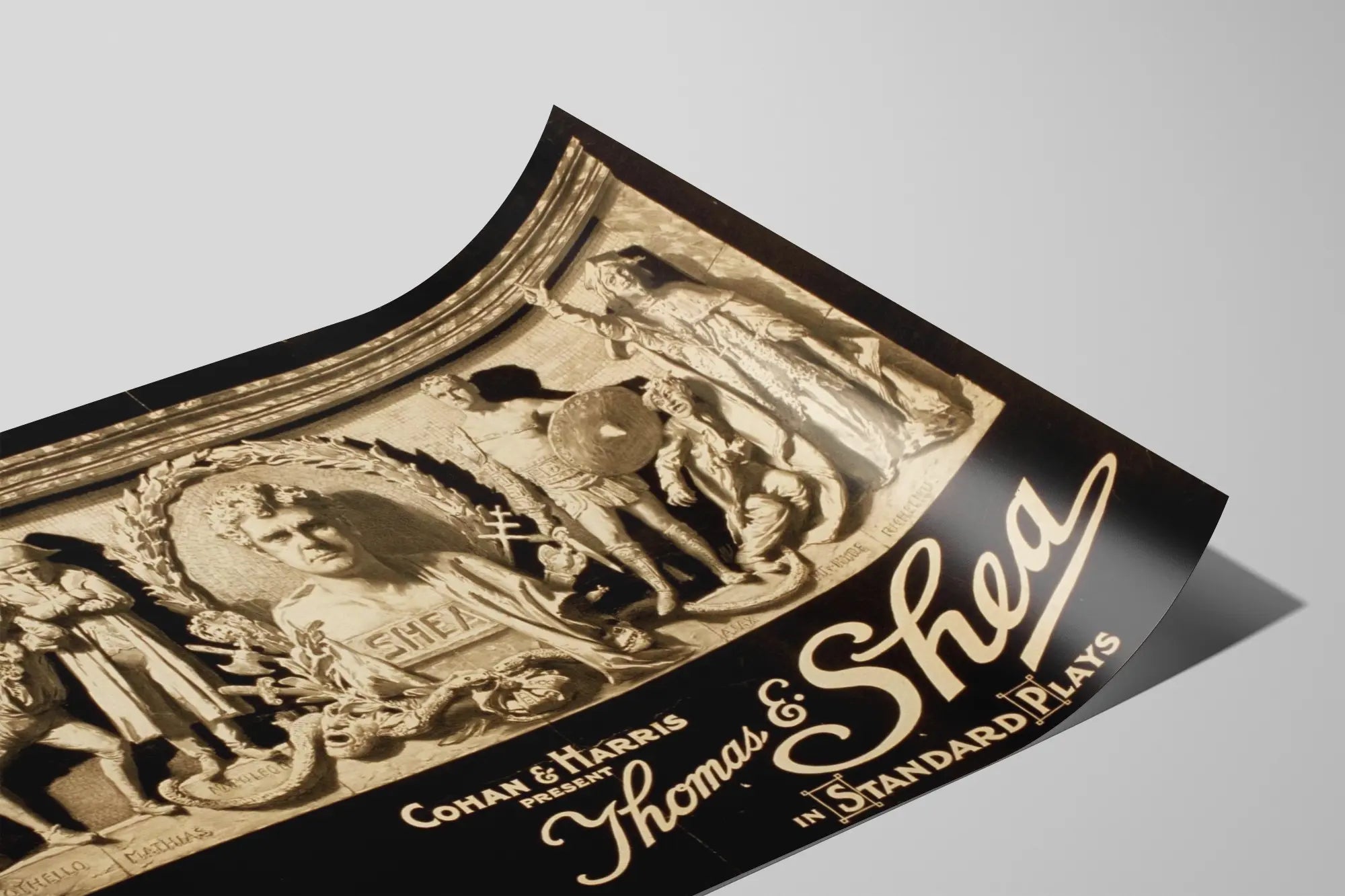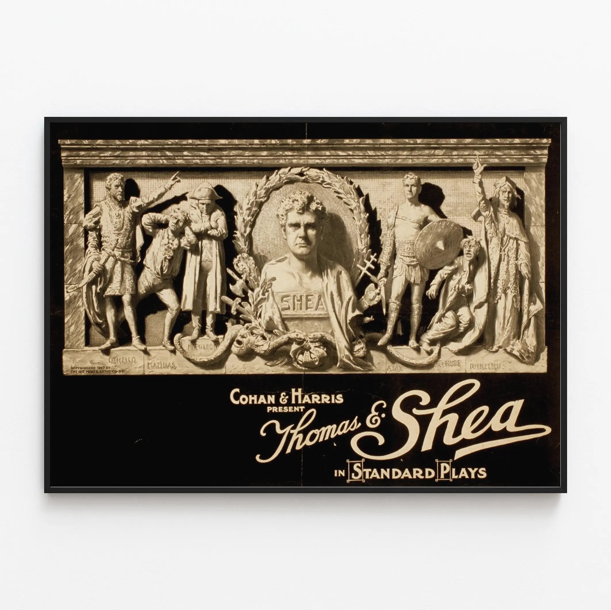 Den här vintageaffischen lyfter fram Thomas E. Shea, presenterad av Cohan & Harris i en serie "Standard Plays". Den centrala kompositionen visar ett relieff med Thomas E. Shea i profil, omgiven av en lagerkrans, vilket väcker en skulptural hyllning. Runt büstet finns olika manliga figurer i historiska och teatrala kostymer som gestaltar klassiska roller, såsom Othello, Napoleon, Ajax och andra, var och en med namn ingraverade på basen.