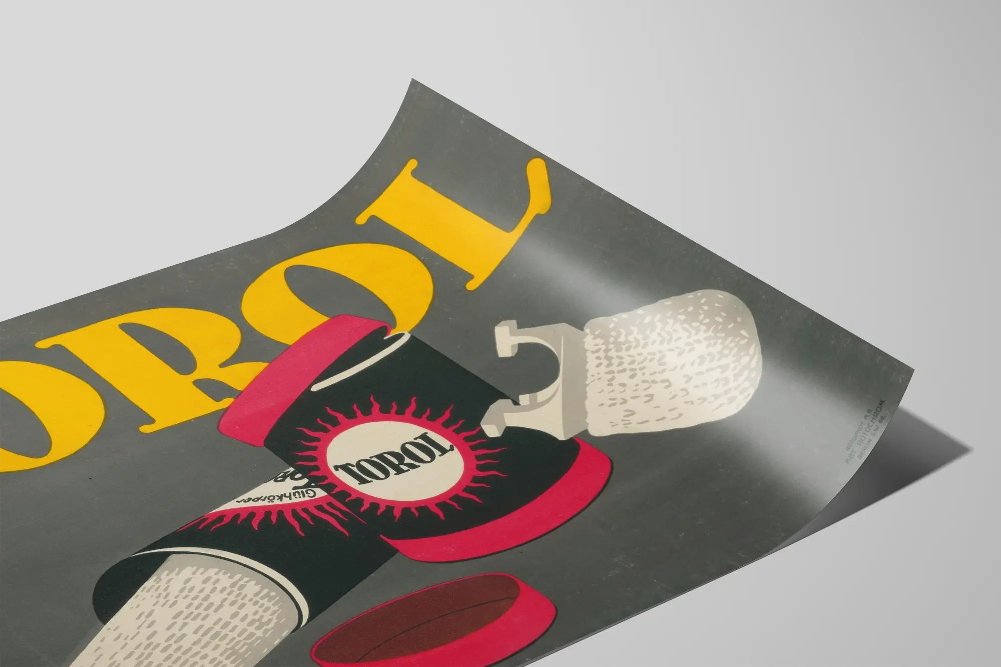 Upptäck denna vintage reklamaffisch som framhäver produkten Torol, presenterad som ett ullgarnrulle av glühkörper-typ. Den grafiska kompositionen leker med kontrasterande färger, med en neutral grå bakgrund som framhäver elementen i svart, vitt och rött. Denna affisch visar i närbild två ullrullar, en till vänster med fin tecknad textur, och en till höger öppen med dess avtagbara lock, vilket gör det möjligt att uppskatta de räfflade stickningsdetaljerna. Texten "TOROL" dyker upp i stora gula bokstäver i den övre delen, vilket ger en tydlig retroprägel till denna väggdekoration. Perfekt för entusiaster av gammal grafisk design och passionerade inredare av industriell eller vintage-stil, tillför denna reklambild en originell och äkta touch till varje inomhusmiljö. Denna affisch har en enkel och ren grafisk stil, som påminner om reklamaffischer från början av 1900-talet. Idealisk för att pryda en vägg i ett vardagsrum, sovrum eller verkstad, och passar även för kommersiella utrymmen som vill skapa en retro och varm atmosfär. Den höga kontrasten och de tydliga formerna gör den till ett dekorativt föremål som fångar blickar samtidigt som det är elegant. Torol-affischen är ett perfekt val för att berika en samling av vintage väggobjekt, oavsett om det är som inramad affisch eller som lös poster. Dess storlek och visuella effekt kommer att framhäva vilken vägg som helst tack vare dess balanserade komposition och direkta typografiska budskap. Genom att välja denna poster, väljer du en väggdekoration med stark identitet och tidlös estetik. Ge ditt boende en känsla av äkthet med denna gamla reklamaffisch med unik grafisk design och oöverträffad retroatmosfär.