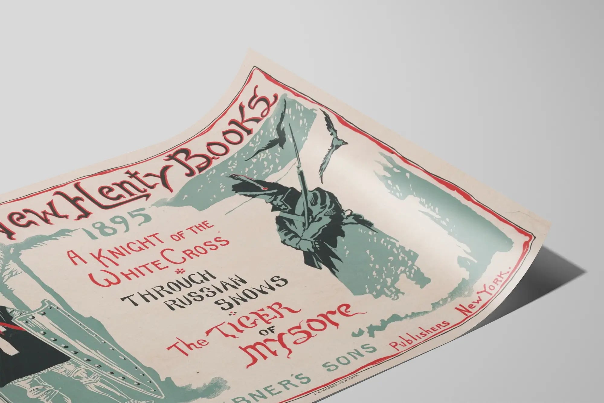 Illustrationen visar till vänster en riddare i full rustning, som håller ett svärd och en stor sköld prydd med ett vitt kors, vilket förstärker den krigiska och historiska känslan av den första titeln. Till höger, en silhuett klädd i en kappa och med en fjäderprydd hatt, som håller ett gevär, framkallar en äventyrs- och expeditionkänsla i snötäckta landskap, i linje med titlarna i mitten och till höger. Affischens ram är fint tecknad med en handmålad röd kant, vilket ger en elegant och hantverksmässig finish till detta gamla plakat.