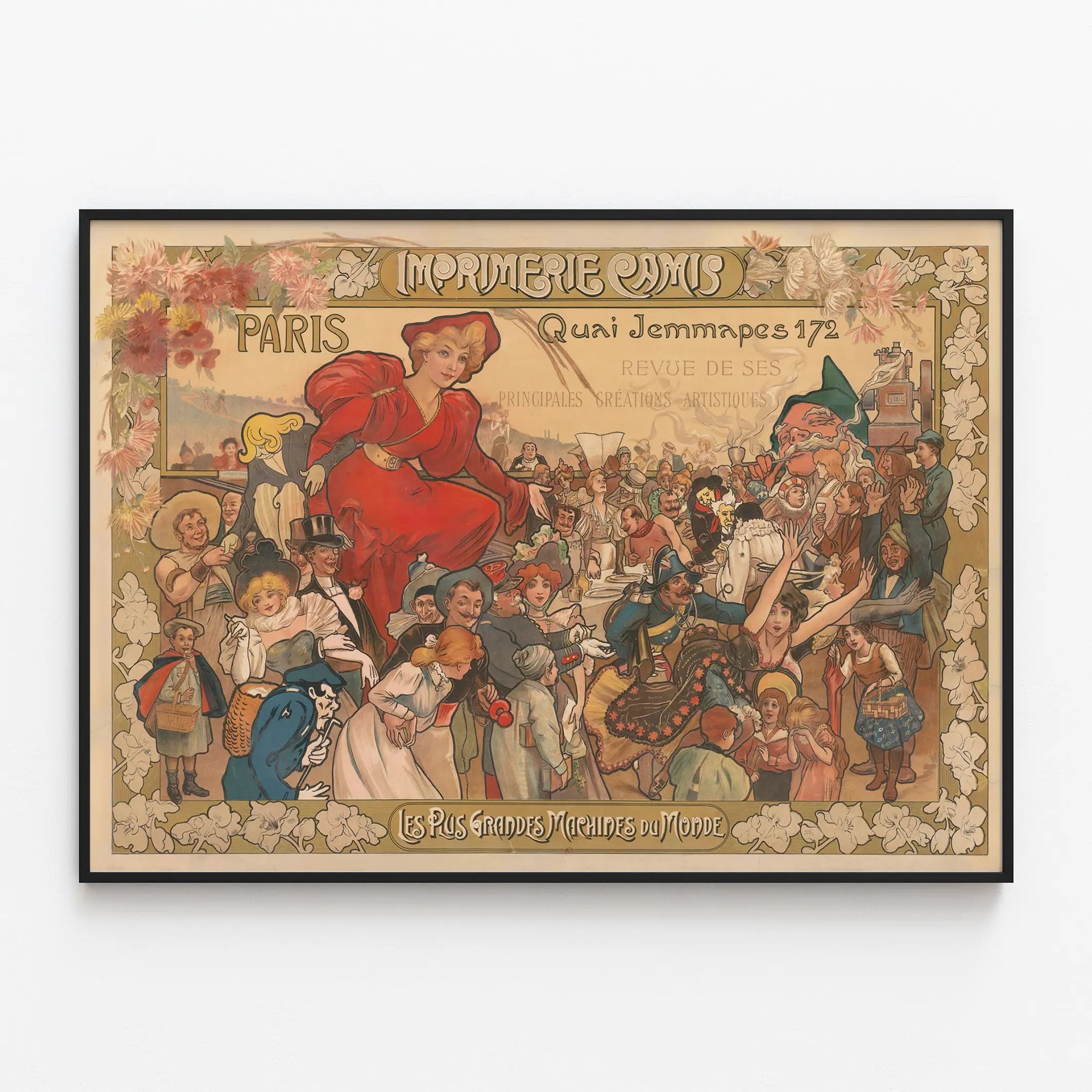 Denna ursprungliga vintageaffisch från tryckeriet Camis, beläget vid Quai Jemmapes 172 i Paris, är ett äkta väggdekorationselement som väcker minnen av den grafiska konsten från äldre tider. Den skildrar en livlig och färgstark folkmassa kring en kvinnlig figur i röd klänning, som förkroppsligar den konstnärliga och festliga andan i tryckeriets främsta skapelser. Denna gamla väggaffisch, rik på detaljer och illustrationer, framkallar en populär scen där maskerade figurer, barn och vuxna blandas i ett levande och dynamiskt tableau. Omgiven av blomsterinslag i pastellnyanser ger den charm och äkthet till ett intryck som söker en retro och elegant stil. Denna lätt åldrade affisch kan förhöja ett vardagsrum, ett arbetsrum eller ett kreativt utrymme genom att erbjuda ett unikt visuellt vittnesmål om tryckets och Paris reklamkonstens historia. Dess vänskapliga och konstnärliga atmosfär inbjuder till nostalgi samtidigt som den uttrycker ett tydligt dekorativt val, perfekt för entusiaster av originell väggdekoration och älskare av gammal grafisk konst.
