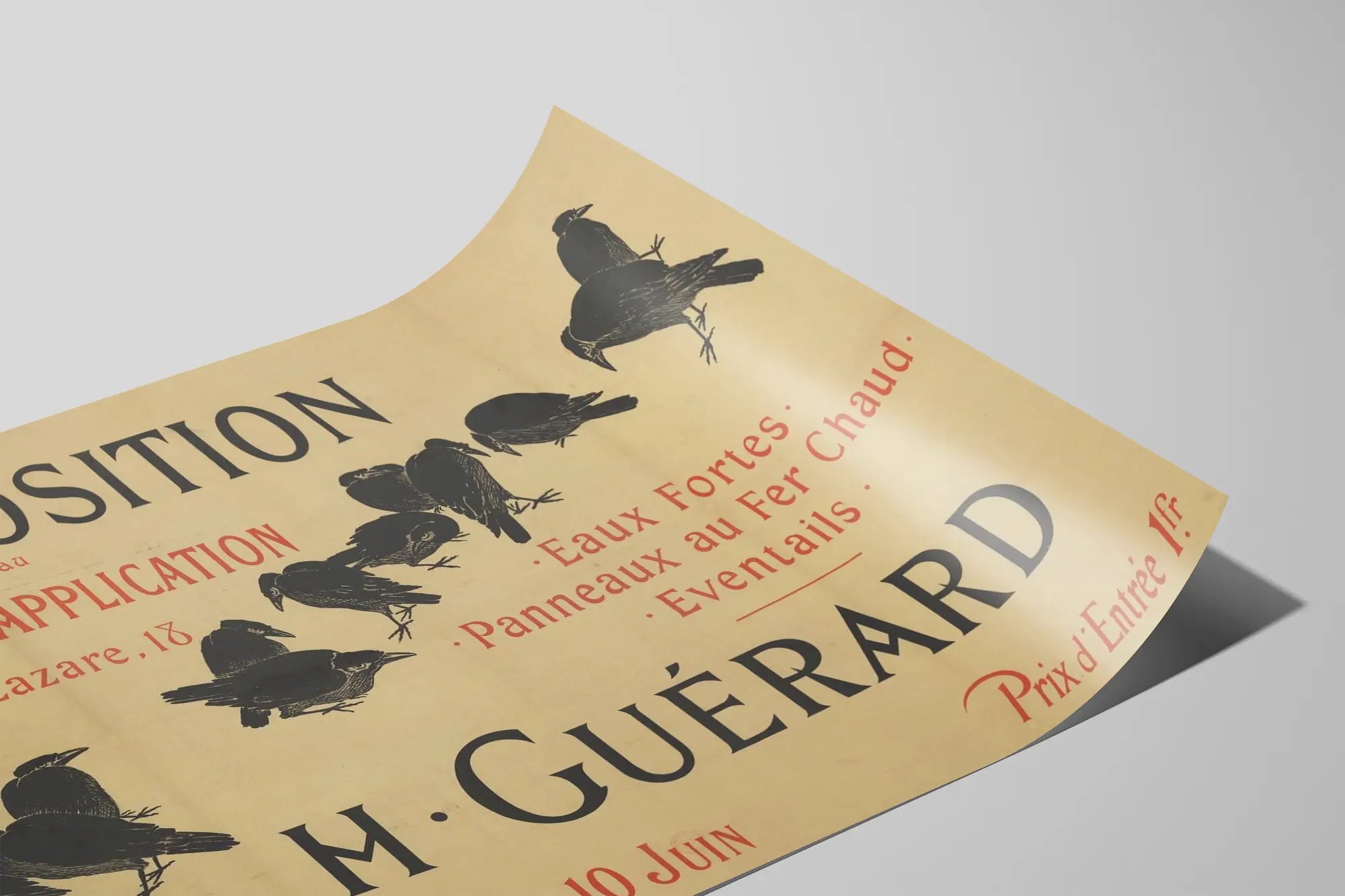 Denna vintageaffisch är ett unikt väggdekorationstycke, perfekt för konstälskare av grafisk konst och kulturhistoria. Den annonserar en utställning som hålls på Skaparteatern, belägen på Saint-Lazare-gatan, från den 26 maj till den 10 juni. Denna poster lyfter fram arbetet av Herr Guérard, specialiserad på etsningar, varmplåtskyltar samt fläktar, och framhäver traditionella konstnärliga tekniker. Genom sin typografiska stil och sin retrokomposition utstrålar denna tavla en gammaldags charm som tillför elegans och äkthet till ditt hem. Den lätt åldrade ytan på papperet, samt de mörka illustrationerna av kråkor som svävar över affischen, förstärker den vintage och konstnärliga känslan, perfekt för en karaktärsfull väggdekoration. Oavsett om du söker en dekorativ affisch för ett vardagsrum, ett kontor eller ett kreativt utrymme, ger denna utställningsposter en inspirerande och konstnärlig atmosfär. Den hyllar den klassiska grafiska konsten samtidigt som den erbjuder en originell dekoration, där typografi och illustration harmoniskt förenas. Denna retrostiliga tavla är ett utmärkt val för dem som vill kombinera väggdekoration med visuell historia, och tillför en märkbar kulturell dimension till rummet där den är utställd.