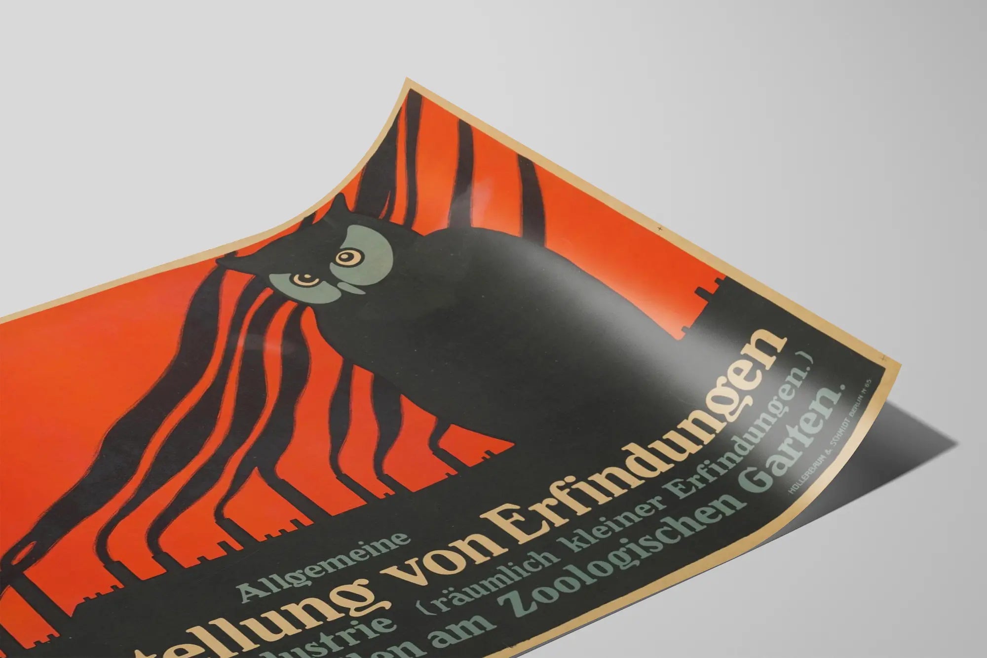 Den här vintageaffischen är ett unikt väggdekorationselement, perfekt för entusiaster av industrihistoria och retrodesign. Skapad för att marknadsföra den allmänna utställningen av små industriella uppfinningar som ägde rum i Berlin 1907, utmärker sig detta reklambildverk med djärvt grafik och slående färger. Den klara röda bakgrunden kontrasterar mot den svarta siluetten av en fabrik med många rykande skorstenar, förstärkt av den imponerande närvaron av en stiliserad uggla som omedelbart fångar blickfånget. Den typografiska elegansen på tyska, med en harmonisk sammansättning i nyanser av beige och ljusblått, kompletterar denna affisch och ger den en äkta charm samt en lätt industriell och mystisk atmosfär. Denna poster är idealisk för väggdekoration i ett kontor, ett utställningsrum eller ett vintageinspirerat interiör, och tillför en rik historisk känsla och en känsla av dynamik som är typisk för denna period av teknisk framsteg. Oavsett om det gäller en entusiast av historiska affischer eller en samlare av originella väggdekorationer, är denna utställningsaffisch från Berlin ett perfekt val för att inge en anda av innovation och industrihistoria i ditt utrymme.