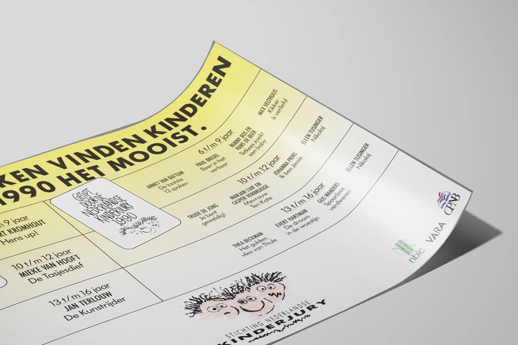 Denna vintageaffisch visar barnens favoritböcker år 1990, utvalda av den nederländska barnjuryen. Den utgör en unik väggdekoration som tilltalar både samlare och entusiastiska läsare av barnlitteratur och retrodesign. Kompositionen är indelad i fyra sektioner som motsvarar specifika åldersgrupper: 6 till 9 år, 10 till 12 år och 13 till 16 år. Varje sektion listar titlar på böcker och författare som präglade denna period, med ett fält som betonar den officiella erkännandet från juryn. Den gulaktiga bakgrunden som tonar över till vitt ger ett ljust intryck samtidigt som den framhäver den kontrasterande svarta typografin. Affischen inkluderar även logotyper för nederländska organisationer kopplade till barnlitteratur, vilket stärker dess äkthet och vintagekänsla.