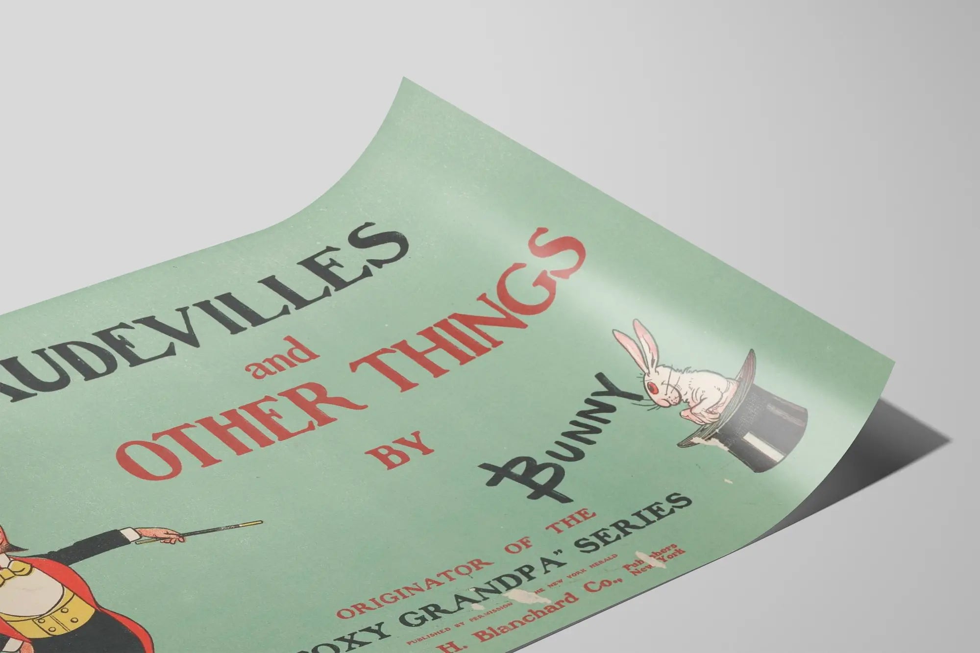 Denna vintageposter med titeln "Vaudevilles and Other Things by Bunny" ger en touch av retrocharm till din väggdekoration. På en mjuk grön bakgrund visar bilden en elegant figur klädd i en svart och röd kostym med en gul fluga, vilket illustrerar den teatrala atmosfären i vaudevilleshower. Till höger sitter en liten vit kanin, vid namn Bunny, i en hög hatt, vilket tillför en lekfull och konstnärlig prägel till hela kompositionen. Texten är presenterad i klassisk typografi, med orden "Vaudevilles" i svart och "Other Things" i rött, vilket förstärker den gamla och äkta stilen i detta unika verk. Denna poster är perfekt för konstälskare och väggdekorationer i retrostil som vill pryda ett vardagsrum, ett kontor eller en teatersal med ett estetiskt och tidlöst motiv. Kombinationen av illustration och typografi gör denna poster till ett originellt dekorativt inslag som passar utmärkt i ett vintage- eller eklektiskt inrett hem. Oavsett om det är en affisch eller poster, fungerar denna väggdekoration som ett attraktivt blickfång, som drar till sig uppmärksamhet med sin originalitet och mjuka ton, samtidigt som den väcker associationer till festliga och humoristiska stämningar från vaudevillen. Perfekt för att tillföra karaktär och nostalgi till dina utrymmen, utmärker sig detta konstverk genom sin äkthet och sitt distinkta grafiska uttryck.
