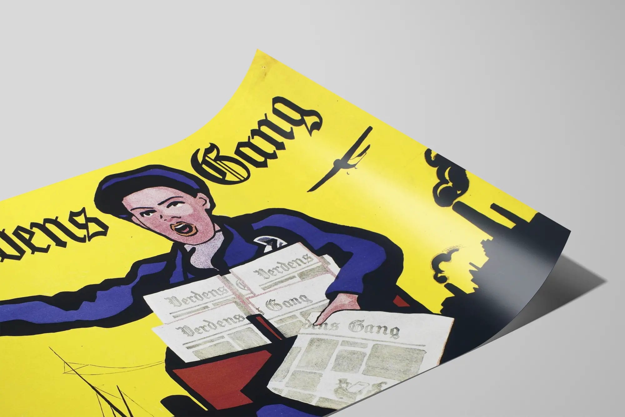 Den här vintageaffischen med titeln "Verdens Gang" är ett unikt konstverk för väggdekoration, perfekt för att tillföra en retro och grafisk touch till ditt hem. Föreställande en tidningsförsäljare i full action, är denna dynamiska illustration framhävd av en livfull gul bakgrund som omedelbart fångar uppmärksamheten. Figuren i mitten, klädd i en mörk uniform och bärande en basker, håller flera exemplar av samma tidning, vars titel i gotisk stil "Verdens Gang" syns högst upp på affischen. Detta typografiska val förstärker den gamla och äkta känslan av denna affisch.