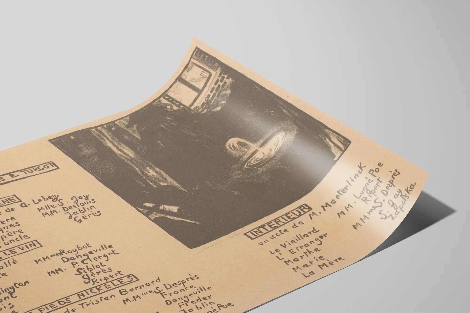 Upptäck denna unika vintageaffisch som föreställer ett gammalt teaterprogram med titeln "L'Œuvre". Denna poster är ett perfekt väggdekoration för konstälskare, teaterentusiaster och kulturhistoriker. På en beige bakgrund visar denna bild en handskriven organisation av föreställningarna, med titlar på akterna och karaktärernas namn, vilket väcker känslan av ett teaterprogram från början av 1900-talet. Den högra delen av affischen erbjuder en fin och slående illustration av en upplyst fontän i ett mörkt inomhusrum, vilket skapar en intressant visuell kontrast som blandar text och bild. Denna balanserade komposition mellan textinformation och grafisk illustration förvandlar denna affisch till ett äkta och nostalgiskt dekorationsobjekt. Oavsett om du är teaterentusiast eller bara söker en väggaffisch i retro- och konstnärlig stil, passar denna vintageposter perfekt i ett vardagsrum, ett kontor eller ett rum för kultur. Dess gamla utseende ger en elegant och tidlös prägel till ditt hem, samtidigt som den berättar en historia genom sina scener och karaktärer. Genom att välja denna väggdekoration satsar du på ett estetiskt och originellt konstverk som förhöjer dina väggar med sin gamla charm.