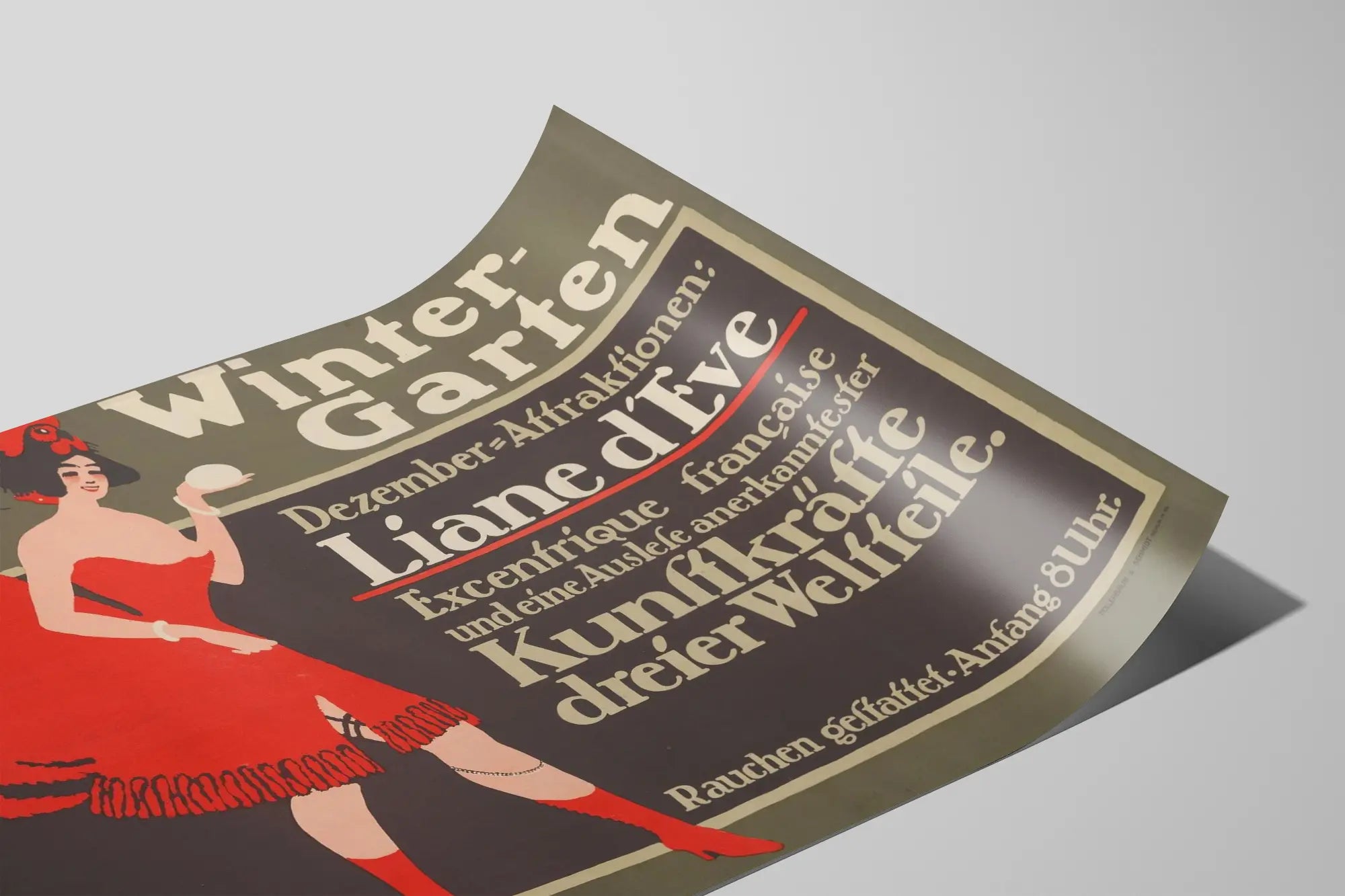 Denna vintageaffisch är ett ikoniskt konstverk som framhäver den berömda attraktionen "Liane d'Eve" vid Winter-Garten. Föreställande en elegant kvinna klädd i en glänsande röd klänning och accessoiriserad med en fjäderhatt, fångar denna väggdekoration omedelbart blickar med sin retrostil och sina kontrasterande färger. Den grafiska designen kännetecknas av en djärv typografi i beige ton på mörk bakgrund, förhöjd av röda inslag som framhäver namnet « Liane d'Eve » och ger dynamik och energi till helheten.