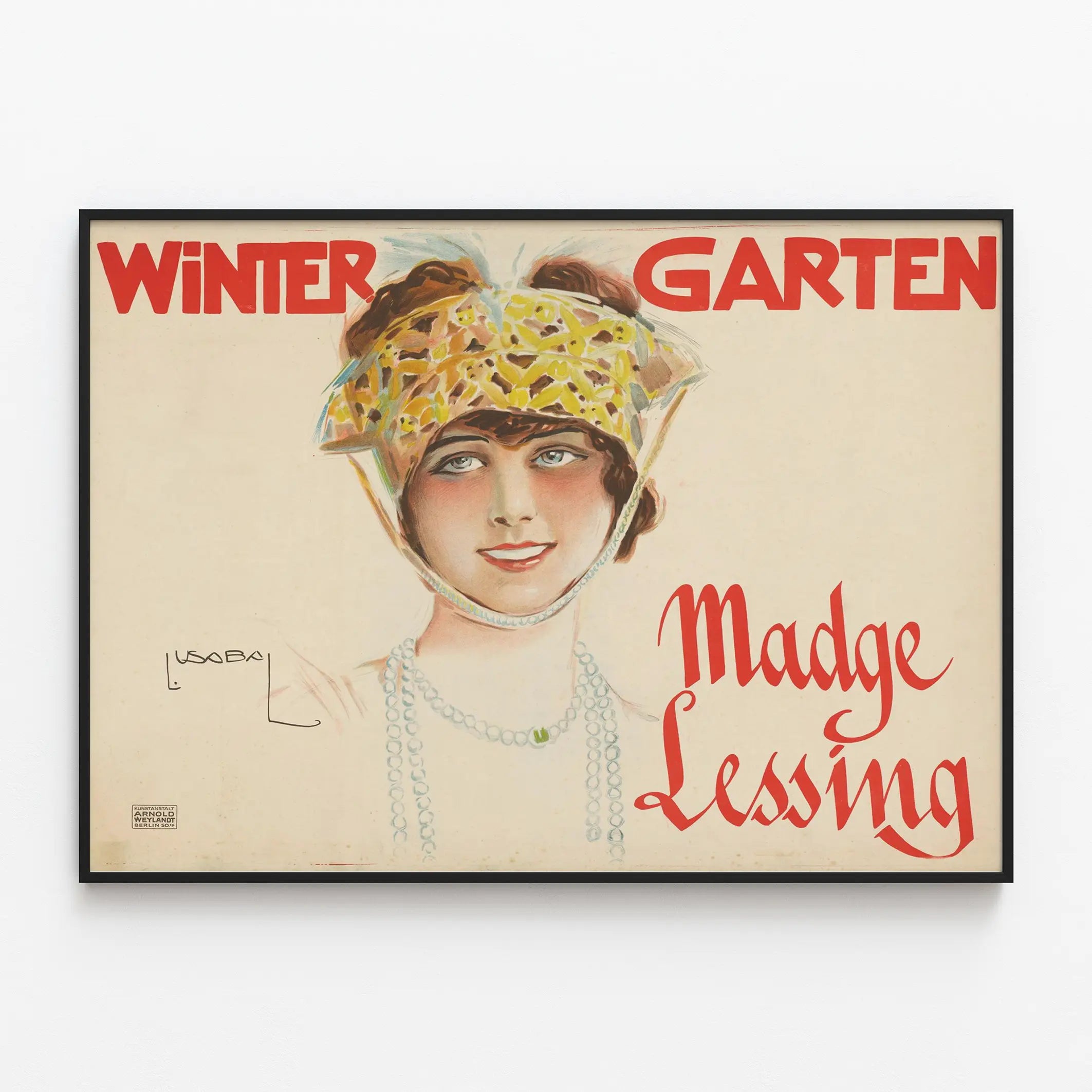 Den här vintageaffischen "Wintergarten Madge Lessing" är ett väggdekorationselement som tillför en touch av retro elegans till varje inredning. Affischen visar ett fint illustrerat porträtt av en kvinna med hatt prydd med gula mönster, med ett pärlhalsband, vars leende och ljusa ögon omedelbart fångar blickfånget. Designen kännetecknas av mjuka färger och precisa linjer, typiska för gammal reklamkonst.