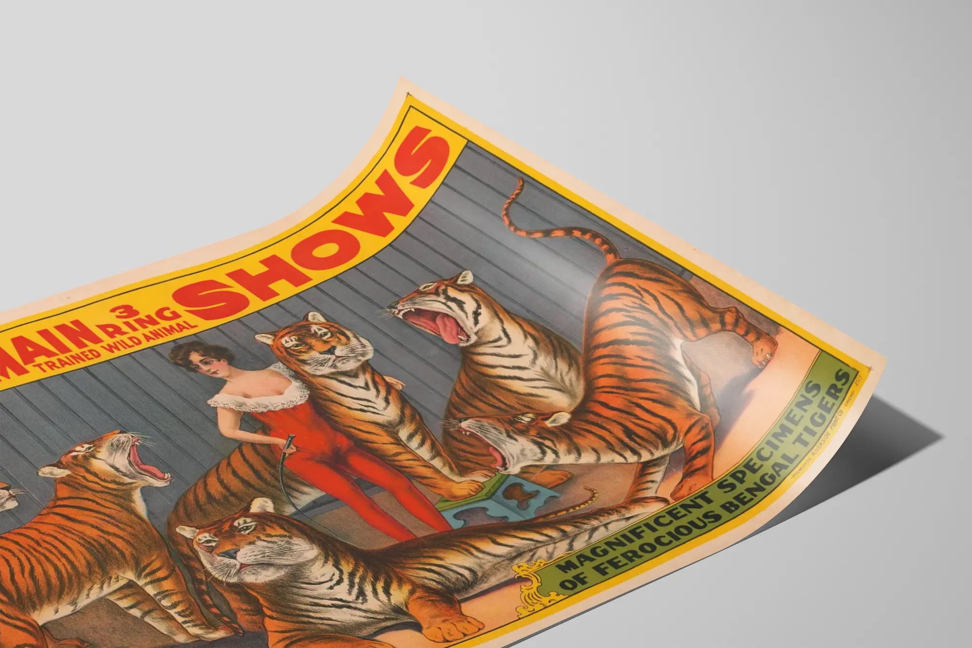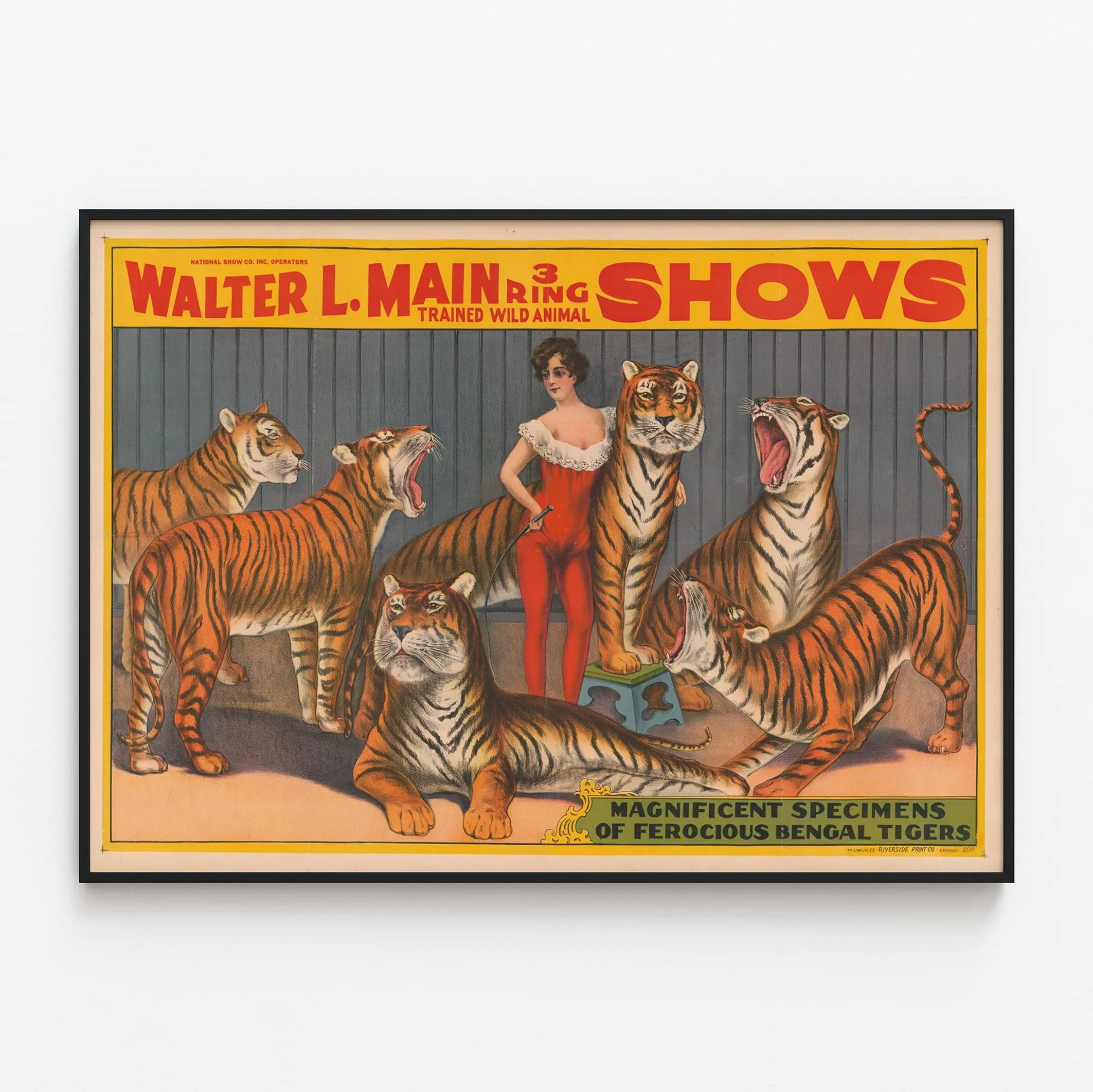 Denna väggdekoration är perfekt för djurälskare och för dem som vill skapa en vintageatmosfär i sitt hem. Den illustrerar på ett utmärkt sätt den spektakulära världen av förr i tiden av djurshower, och lyfter fram relationen mellan människan och de vilda tränade djuren. Texten upptill och nedtill på affischen, i livfulla röda och gula bokstäver, tillför en tidsenlig typografisk charm och framhäver truppens namn samt beskrivningen av tigrarna, som kallas "magnifika exemplar".