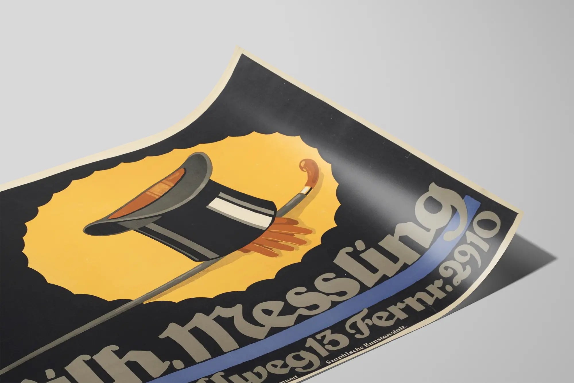 Denna vintageaffisch visar en djärv grafisk komposition med en svart hög hatt tillsammans med en käpp, båda stiliserade med dämpade färger mot en lysande gul bakgrund omgiven av svart skugga. Denna fängslande väggdekoration drar till sig uppmärksamhet genom sin slående kontrast och den typiska retro-grafiska stilen som är karakteristisk för klassiska reklamaffischer. Texten i gotisk stil meddelar « Wilh. Messling » och en adress « Ostenhellweg 13 » med ett telefonnummer, vilket tillför en äkta och historisk charm till denna skapelse. Perfekt för entusiaster av retro väggdekoration, passar denna affisch utmärkt in i ett vintageinspirerat inomhusmiljö och tillför en touch av elegans och originalitet. Oavsett om det är i ett vardagsrum, ett kontor eller en butik, fångar denna dekorativa poster uppmärksamheten och inbjuder till att fördjupa sig i en tidsperiod. Kombinationen av hög hatt och käpp symboliserar en klassisk och distingerad anda, som kommer att tilltala designälskare och entusiaster av gammal reklamkonst. Med sina dominerande färger svart, gult och inslag av grått, anpassar sig denna affisch lätt till olika inredningsstilar och tillför en touch av sofistikering och historia. Ett perfekt val för att berika din samling av posters eller för att smakfullt och originellt dekorera en vägg.