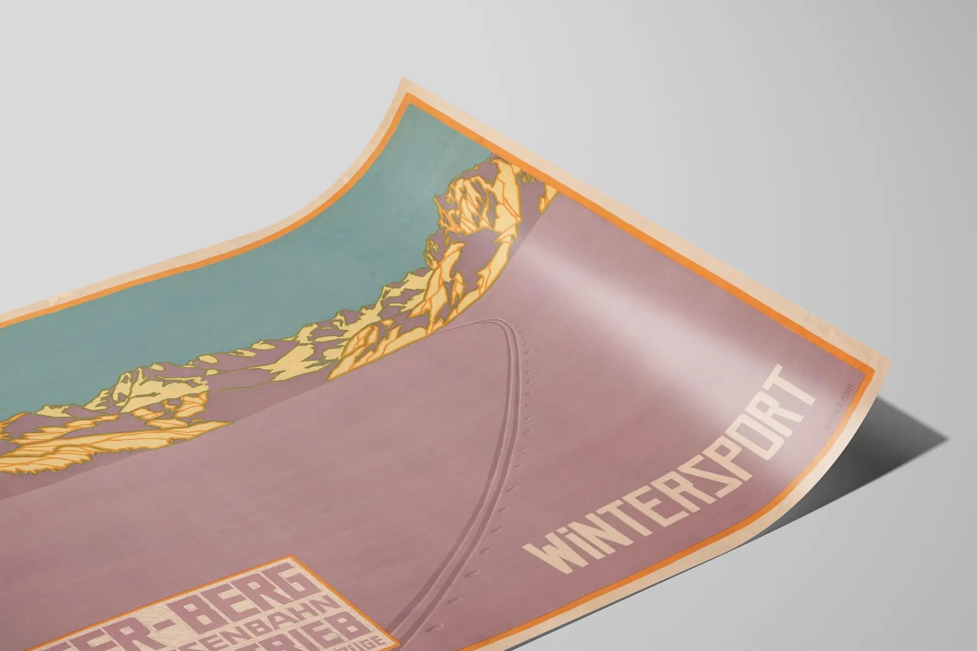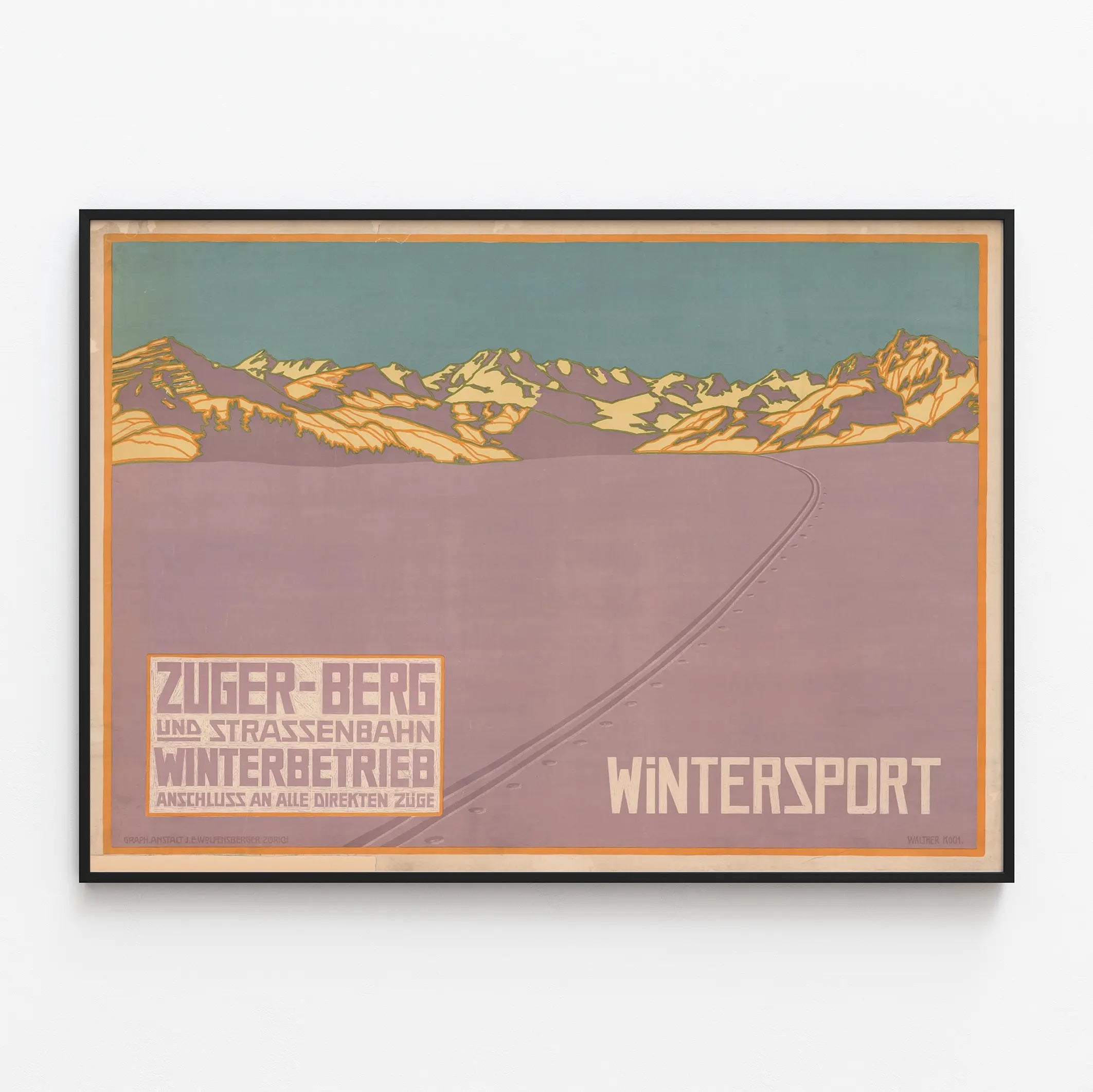 Den här vintageaffischen Zuger-Berg und Strassenbahn Winterbetrieb är ett perfekt väggdekoration för älskare av vintersporter och alpina landskap. Dess grafiska komposition framhäver ett vidsträckt snöklätt landskap i förgrunden, markerat av fotavtryck och en bana som bildar en mjuk linje mot stiliserade berg i bakgrunden. Färgpaletten, dominerad av pastelltoner av lila, blått och kräm, skapar en lugn och kylig atmosfär, typisk för vinterscener. Bergen, med sina snötäckta toppar och förenklade former, framkallar ett vinterlandskap som passar för skidåkning och andra vintersporter, vilket förstärker temat "Vinteridrott" som är tydligt markerat med geometriska bokstäver. Den tyska texten i nedre vänstra delen hänvisar till Zuger-Berg och vintertåget, vilket antyder en promenad eller lättillgänglighet till vinterfriluftsområden, en idé som passar perfekt med denna reklamaffisch. Denna poster kombinerar den retro grafiska elegansen med en direkt koppling till naturen och utomhussport. Den passar utmärkt som en vintage väggdekoration i vardagsrummet, hallen eller ett utrymme för bergsintresserade. Tavlan väcker både nostalgi för gamla schweiziska annonser och den aktiva andan i vintersport, och ger ditt hem en originell och konstnärlig prägel. Ge dina väggar en elegant och tidlös bergskänsla med denna Zuger-Berg-affisch, perfekt för entusiaster av äkta väggdekoration och för alla som älskar snötäckta landskap och vinteräventyr.