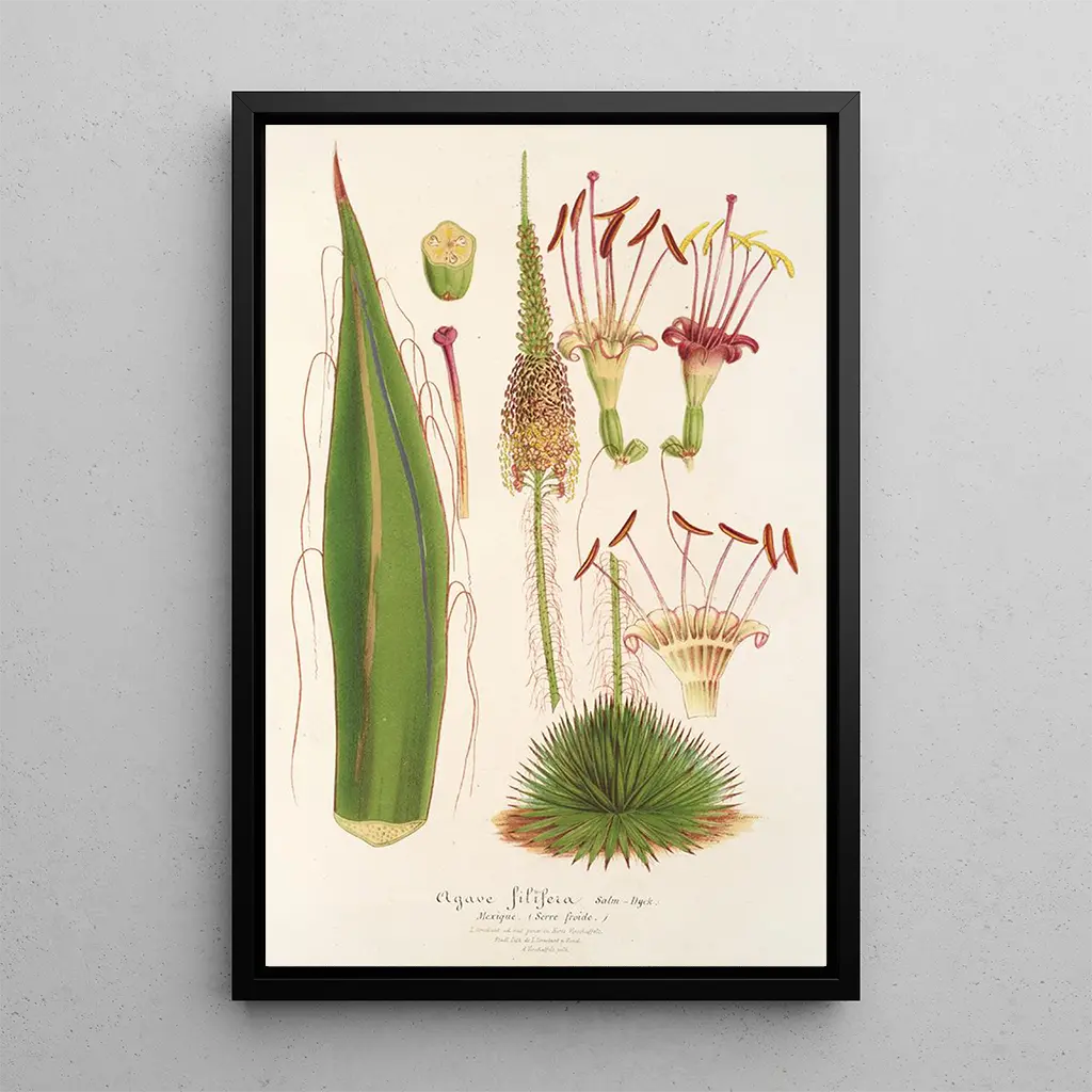 Agave filifera : en dans av former och ljus L'œuvre "Agave filifera" av Charles Antoine Lemaire är en hyllning till naturen, där de delikata linjerna av bladen blandas med nyanser av lysande grönt. Kompositionen framkallar en subtil harmoni mellan den geometriska precisionen hos växten och ljusets flytande rörelse som leker över dess konturer. Lemaire, som en mästerlig botaniker, använder graveringstekniker som inte bara avslöjar den estetiska skönheten hos agave, utan också dess komplexa struktur. Atmosfären som utstrålar denna konstnärliga reproduktion är både lugn och fängslande, och inbjuder betraktaren att fördjupa sig i den fascinerande världen av suckulenta växter. Charles Antoine Lemaire : en pionjär inom botanisk illustration Charles Antoine Lemaire, botanist och illustratör från 1800-talet, präglade sin tid med sina bidrag till botanisk illustration. Påverkad av samtidens upptäckter och den romantiska rörelsen, lyckades han fånga skönheten hos exotiska växter med en anmärkningsvärt noggrann precision. Lemaire samarbetade med många forskare och publicerade flera verk som berikade kunskapen om växtarter. Hans arbete med "Agave filifera" vittnar om hans engagemang för att dokumentera den botaniska mångfalden, samtidigt som han tillförde en konstnärlig touch till sina illustrationer. Hans arv består, och inspirerar fortfarande idag botaniker och konstälskare. En dekorativ reproduktion med många fördelar Reproduktionen av "Agave filifera" är ett dekorativt konsttryck som harmoniskt passar in i olika utrymmen, oavsett om det är ett modernt vardagsrum, ett elegant kontor eller ett lugnt sovrum. Dess utskriftskvalitet och trohet mot detaljerna i originalverket gör den till ett perfekt val för dem som uppskattar naturens skönhet. Denna tavla ger ett fräscht och originellt inslag till din inredning, samtidigt som den väcker beundran hos besökare. Genom att välja denna konsttryck investerar du i ett verk som kombinerar estetik och kultur, och berikar din vardagliga miljö.