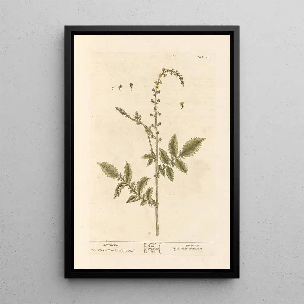 L'œuvre "Aigremoine" av Elizabeth Blackwell är en fängslande illustration som lyfter fram denna växt med gyllene blommor. Med noggranna detaljer och en palett av livfulla färger lyckas Blackwell förmedla grace och lätthet hos aigremoine. De slanka stjälkarna och de små blommorna i klasar skapar en harmonisk komposition, som framkallar en atmosfär av friskhet och vitalitet. Denna duk, både konstnärlig och vetenskaplig, inbjuder till att utforska naturens underverk samtidigt som den hyllar skönheten hos medicinska växter.